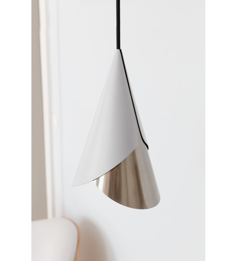 Lampa Cornet UMAGE opiera się na niezwykle banalnym pomyśle. Dwa niezależne metalowe "rożki" w różnych kolorach nakładane są na przewód z oprawką żarówki i w ten sposób powstaje ta intrygująca forma. Asymetryczność każdego z elementów pozwala na zabawę z ostatecznym wyglądem dzięki obracaniu ich na kablu. Pozwala to także w pewnym zakresie kierować strumieniem światła. Poszczególne kolory można także zamienić kolejnością, aby eksponować bardziej stal lub kolor. Cornet to prosty, lecz pełen uroku, ciepła i fantazji produkt.
