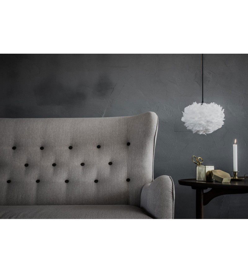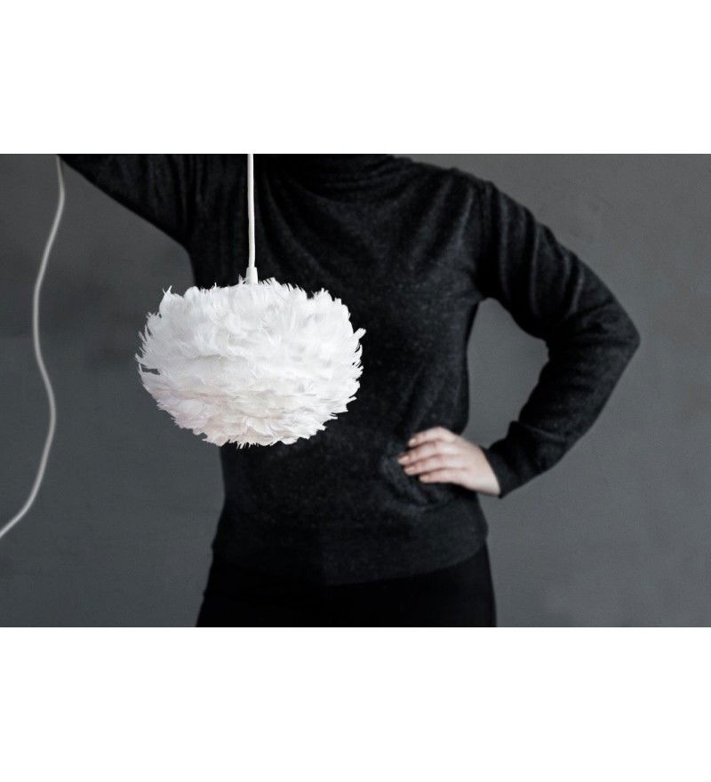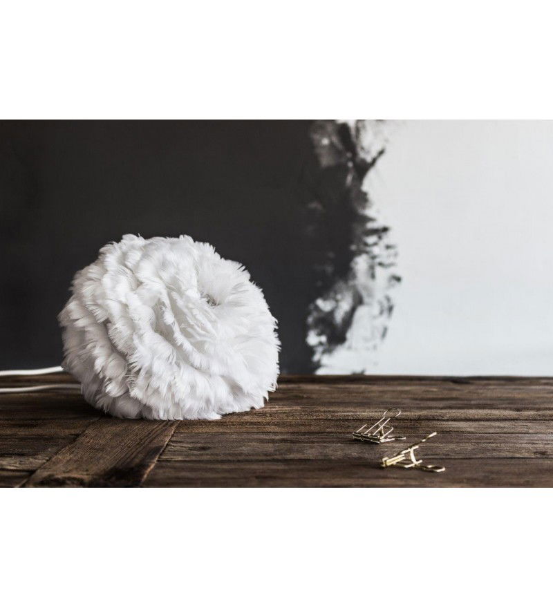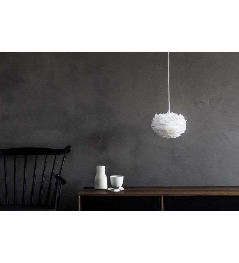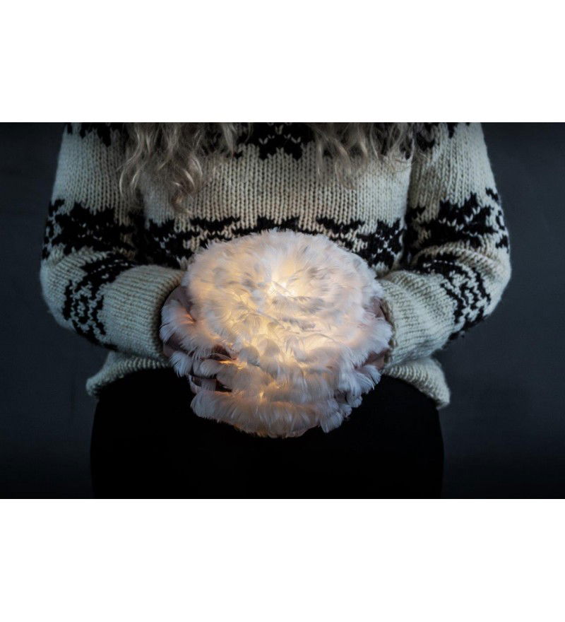 Lampa Eos micro to najmniejsza wersja lampy z rodziny EOS UMAGE (dawniej VITA Copenhagen). Jej piękny, filigranowy kształt mierzy 22 cm średnicy i 16 cm wysokości. Jest wykonana z autentycznych ptasich piór, z których każde ręcznie, starannie umieszczono na papierowym rdzeniu. Emituje przytulny i przyjemny blask, ponieważ żarówka jest osłonięta dając klimatyczny nastrój. Eos micro jest idealna do powieszenia w grupie w przedpokoju, w sypialni lub jakimkolwiek innym miejscu, w którym chcesz stworzyć subtelny nastrój.