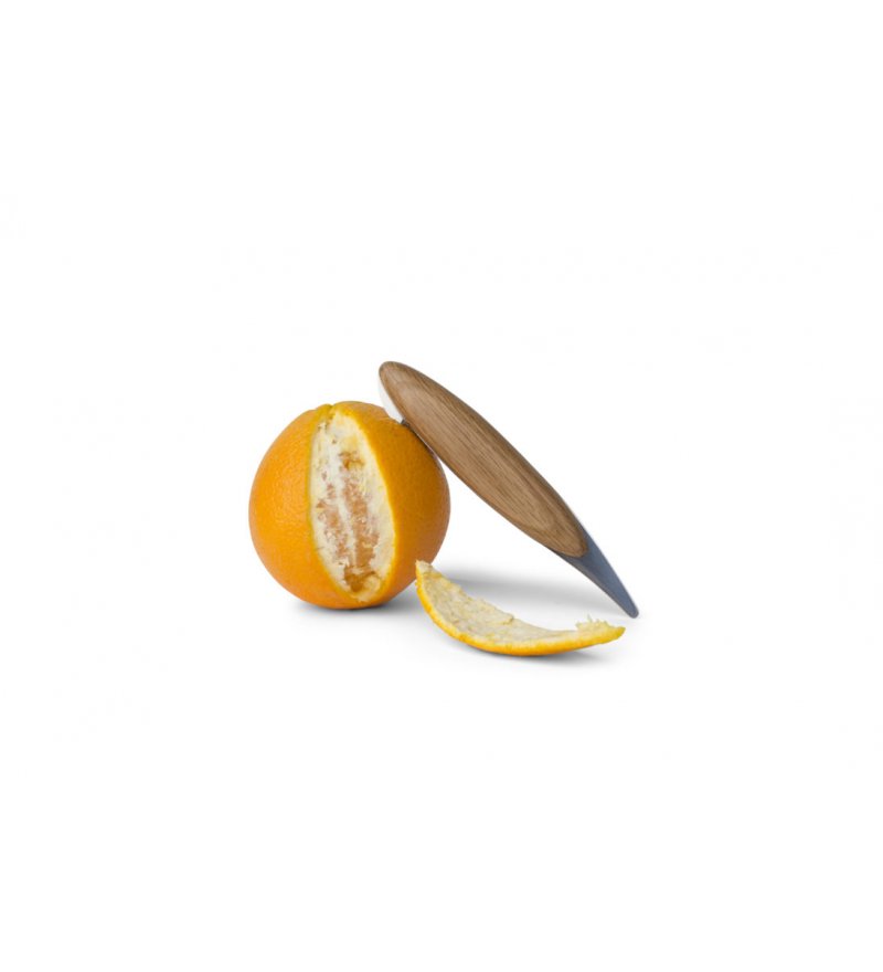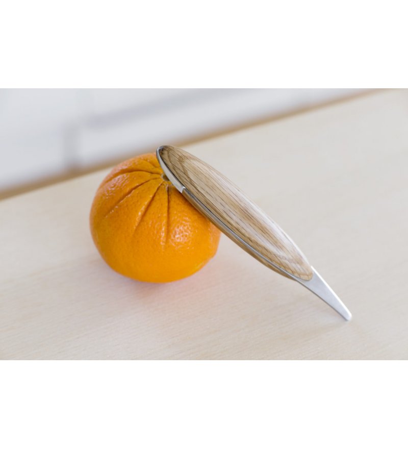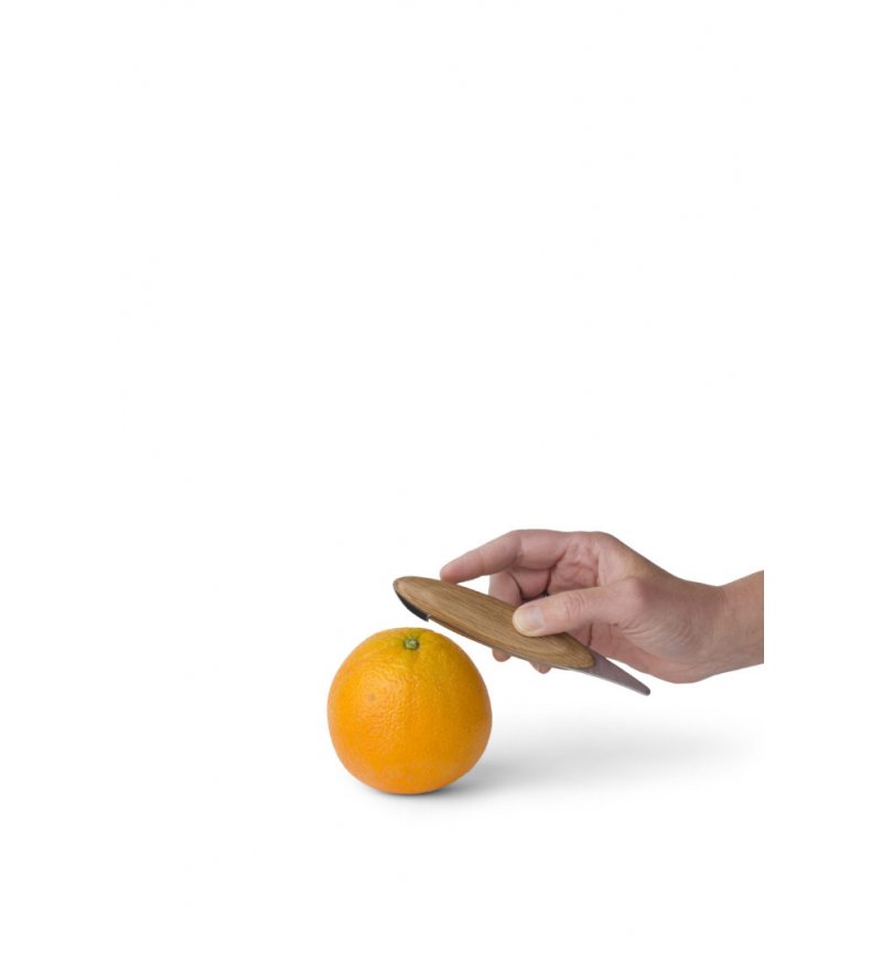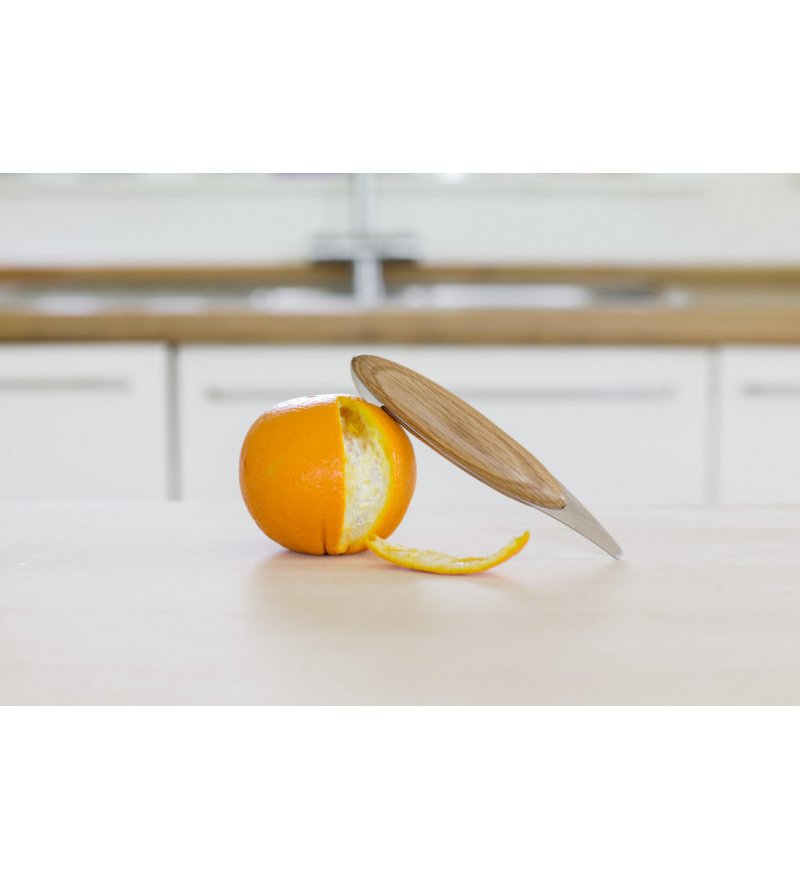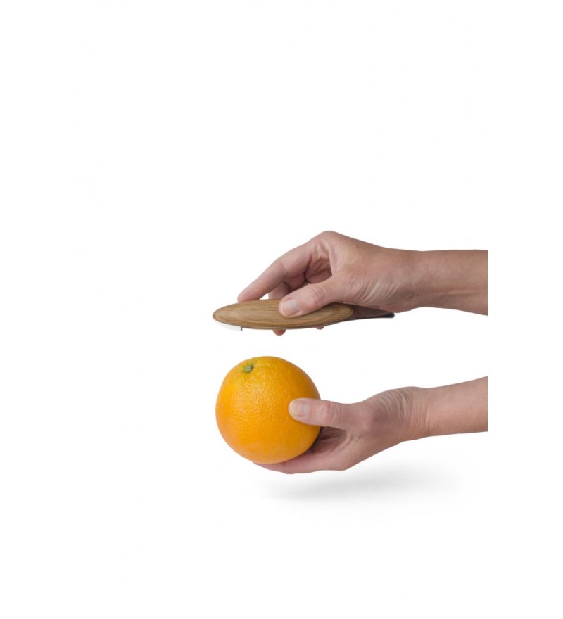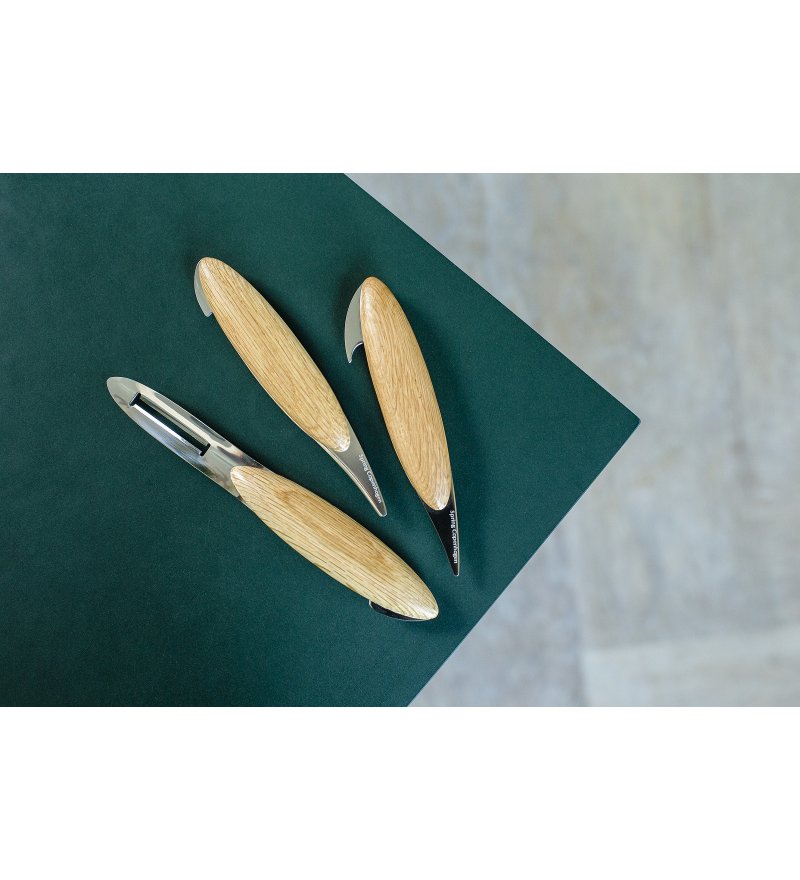 Obieraczkę wykonano z drewna dębowego i stali nierdzewnej. Wyprofilowana rączka zapewnia wygodny uchwyt. Ze względu na ręczną produkcję każdy egzemplarz może różnić się np. usłojeniem drewna.