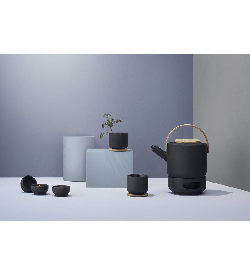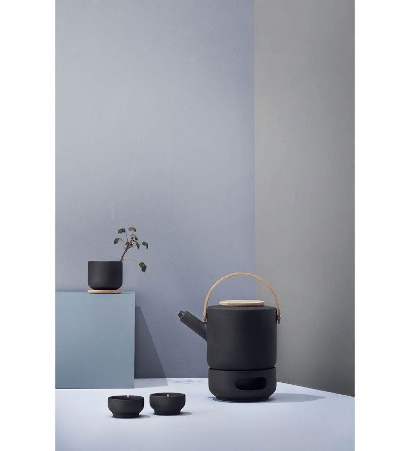 Dzbanek do herbaty Theo marki Stelton to wyrób ceramiczny w klasycznym Skandynawskim stylu o wykończeniu z żeliwa. Uchwyt oraz pokrycie dzbanka wykonane zostało z drewna bambusowego co nasuwa na myśl inspirację tradycyjnym japońskimrytuałem parzenia herbaty. Te wszystkie elementy wykończenia formy oraz ciemny kolor w odcieniu brązowo-czarnym nadają produktowi prostą minimalistyczną zrównoważoną formę.