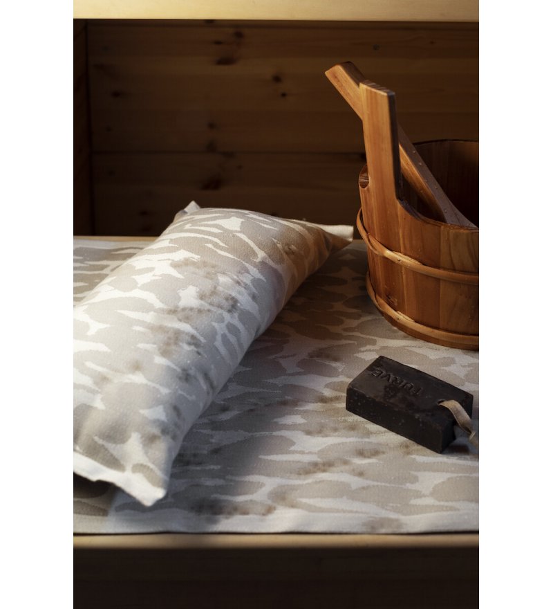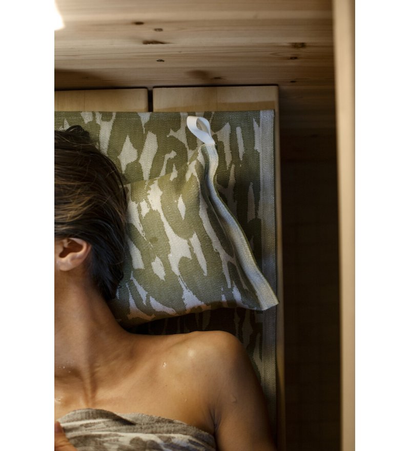 W kolekcji znajdują się akcesoria do sauny: maty, poduszki, ręczniki oraz termofor w wełnianym pokrowcu.