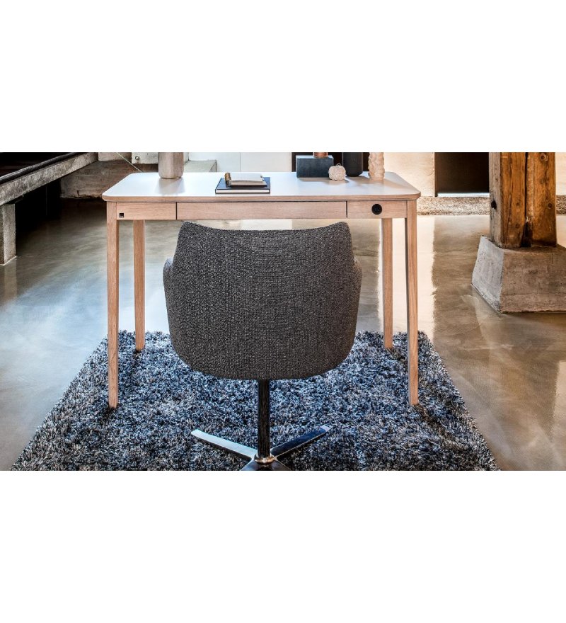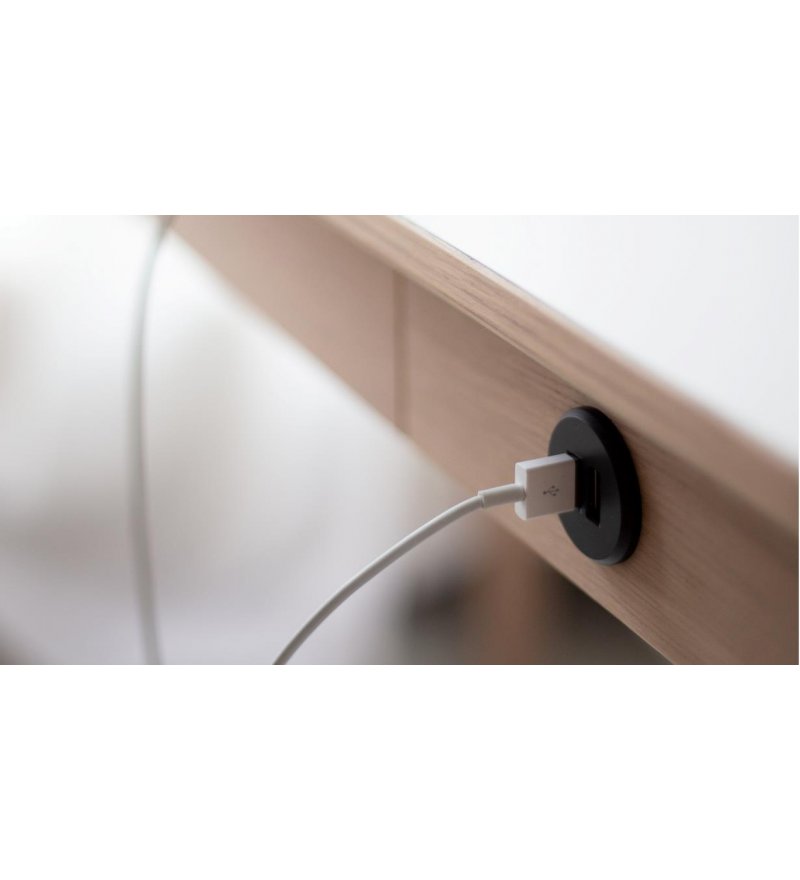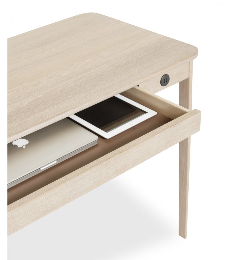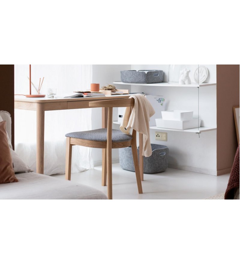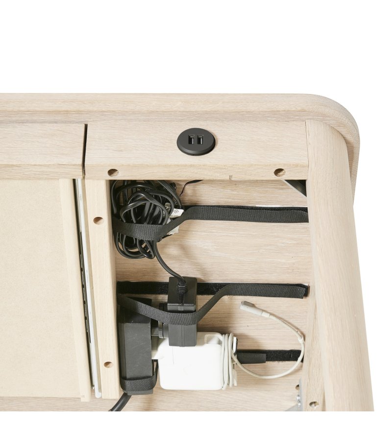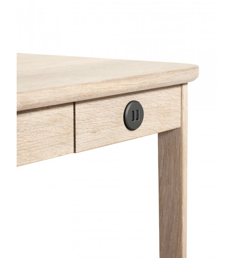 Biurko SM131 wyróżnia blat z dębiny o zaokrąglonych narożnikach. Mebel zapewnia piękną i funkcjonalną przestrzeń roboczą. Klasyczna rama nośna zwieńczona jest czterema drewnianymi nogami. Biurko ma fabrycznie zainstalowane wtyczki USB, pojemną szufladę i paski na rzepy na przewody i kable.