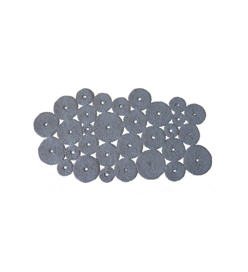 Ręcznie dziergany dywan z grubego bawełnianego sznurka (0.5 cm). Wykonany na drutach z ok. 1000 m sznurka. Dywan wykonany z pojedynczych krążków, które po połączeniu tworzą wyjątkowy dodatek do wnętrz. Niepowtarzalny charakter każdego egzemplarza.