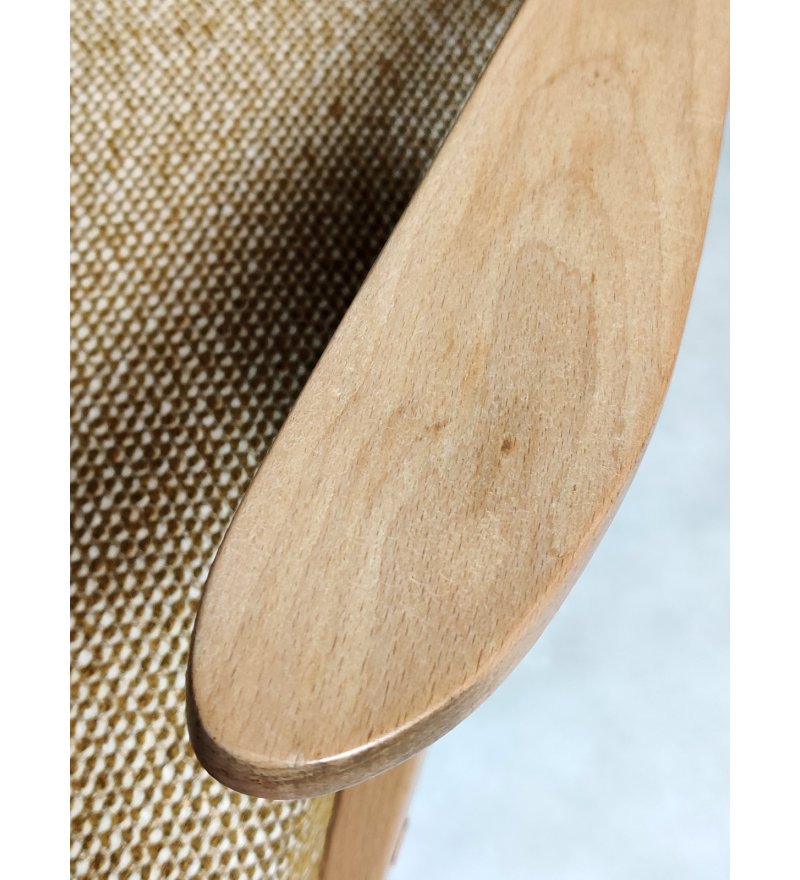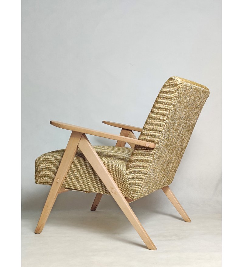 Oryginalny polski fotel tapicerowany B-310 Var z lat 60-tych XX w. poddany profesjonalnej renowacji przez wykwalifikowanego tapicera zgodnie z najwyższą sztuką tapicerską.