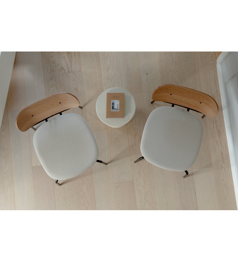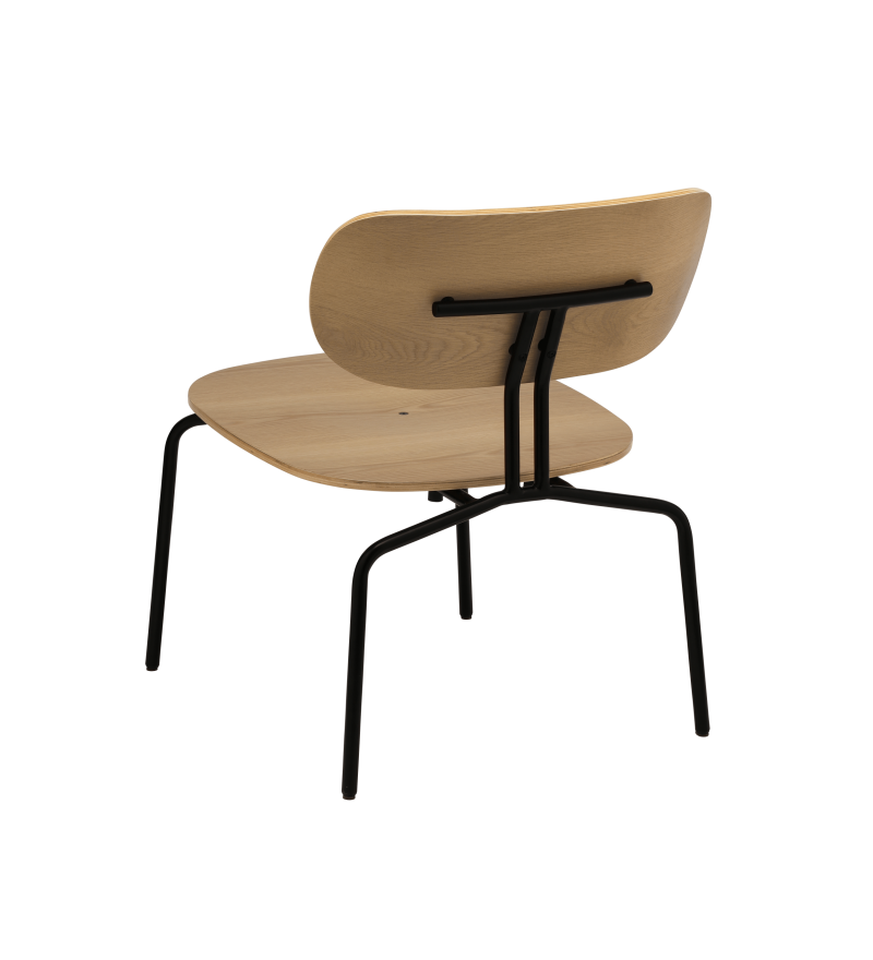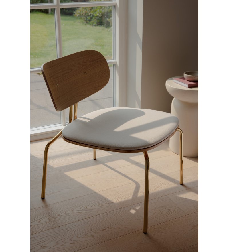 Curious lounge chair to krzesło o lekkim, minimalistycznym i eleganckim wyrazie. Wykonane ze sklejki fornirowanej dębem. Dostępne z mosiężnymi lub czarnymi nogami w wykończeniu gładkim lub z opcją tapicerowanej poduszki na siedzisko, która zwiększa komfort.