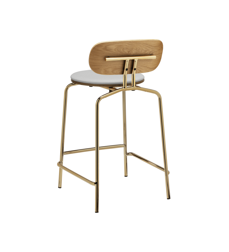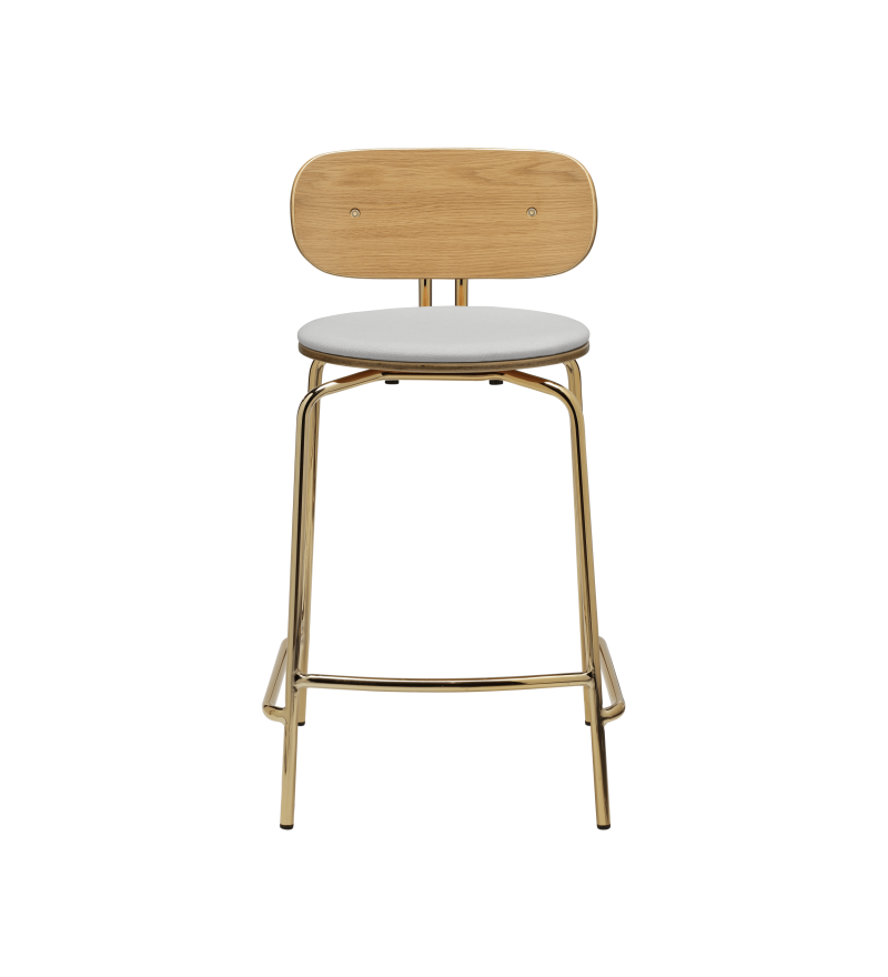 Curious to hoker o lekkim, minimalistycznym i eleganckim wyrazie, który łączy w sobie wyrafinowanie z praktycznością. Wykonany ze sklejki fornirowanej dębem. Dostępny z mosiężnymi lub czarnymi nogami w wykończeniu gładkim lub z opcją tapicerowanej poduszki na siedzisko, która zwiększa komfort. Wyposażony jest w podnózek, który zapewnia dodatkową wygodę.