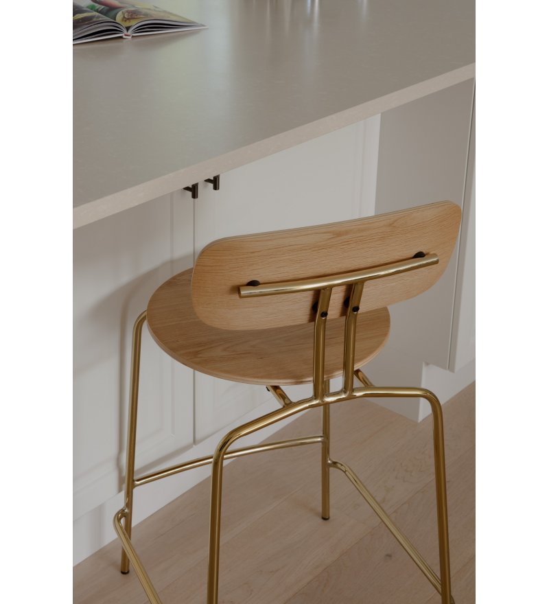 Curious to hoker o lekkim, minimalistycznym i eleganckim wyrazie, który łączy w sobie wyrafinowanie z praktycznością. Wykonany ze sklejki fornirowanej dębem. Dostępny z mosiężnymi lub czarnymi nogami w wykończeniu gładkim lub z opcją tapicerowanej poduszki na siedzisko, która zwiększa komfort. Wyposażony jest w podnózek, który zapewnia dodatkową wygodę.