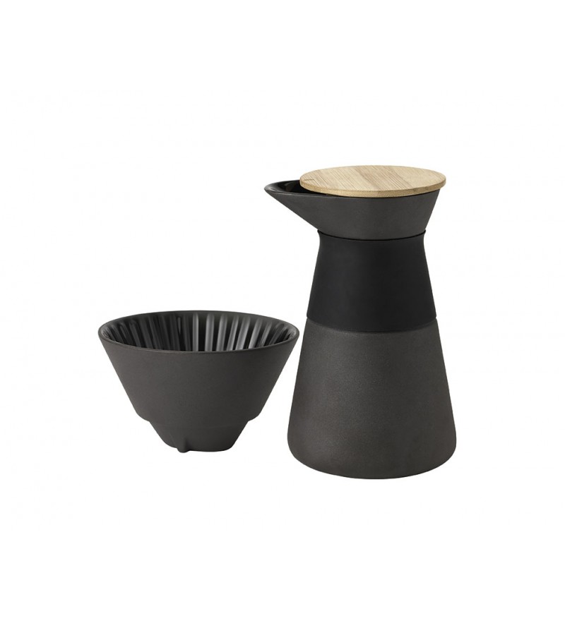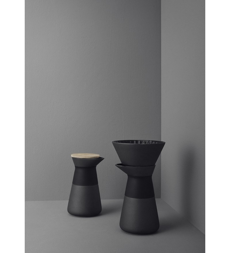 Ekspres do kawy Theo marki Stelton to projekt w klasycznym Skandynawskim stylu o wykonany z ceramiki w kolorze czarnym. Ekspres przeznaczony jest do parzenia kawy alternatywną metodą parzenia - drip. Zamiast uchwytu zastosowano w nim innowacyjne rozwiązanie i część powłoki zewnętrznej pokryta jest silikonem, który jest dobrym izolatorem. Dodatkowo posiada on również przykrywkę z drewna bambusowego, której funkcją jest dłuższe utrzymanie temperatury kawy. Forma ekspresu jak i pozostałych elementów należących do kolekcji Theo nasuwa na myśl inspirację tradycyjnym japońskim rytuałem parzenia herbaty. Te wszystkie elementy wykończenia formy oraz ciemny kolor nadają produktowi prostą minimalistyczną zrównoważoną formę.
