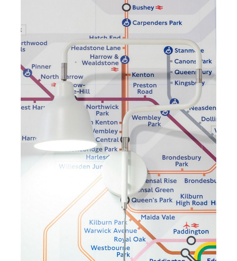 Lampa ścienna London to doskonały projekt. Swoim kształtem nawiązuje do rozbudowanej sieci londyńskiego metra. Jest świetną alternatywą dla typowych lamp ściennych. Została zaprojektowana z polotem, kreatywnością i humorem. Nietuzinkowe ramię lampy jest ruchome w dwóch miejscach, abażur także jest ruchomy. Biel nadaje lampie bardziej kobiecy i delikatny charakter. Przyciąga uwagę i łamie schematy!
