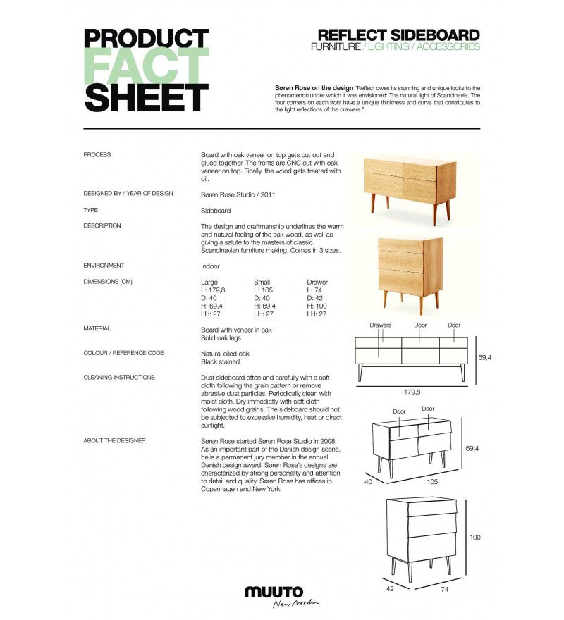 Seria Reflect Muuto obejmuje 2 klasyczne komody o długości 105 cm i 180 cm oraz szafkę (komodę) z 3 szufladami. Kolekcja ta to hołd złożony klasycznemu rzemiosłu i doskonałemu skandynawskiemu wzornictwu. Reflect koncentruje się na ukazaniu piękna naturalnych materiałów. Subtelnie profilowane krawędzie i fronty mebli, dzięki grze światła, eksponują urok struktury drewna - jego usłojenie, ziarnistość, przejścia tonalne.