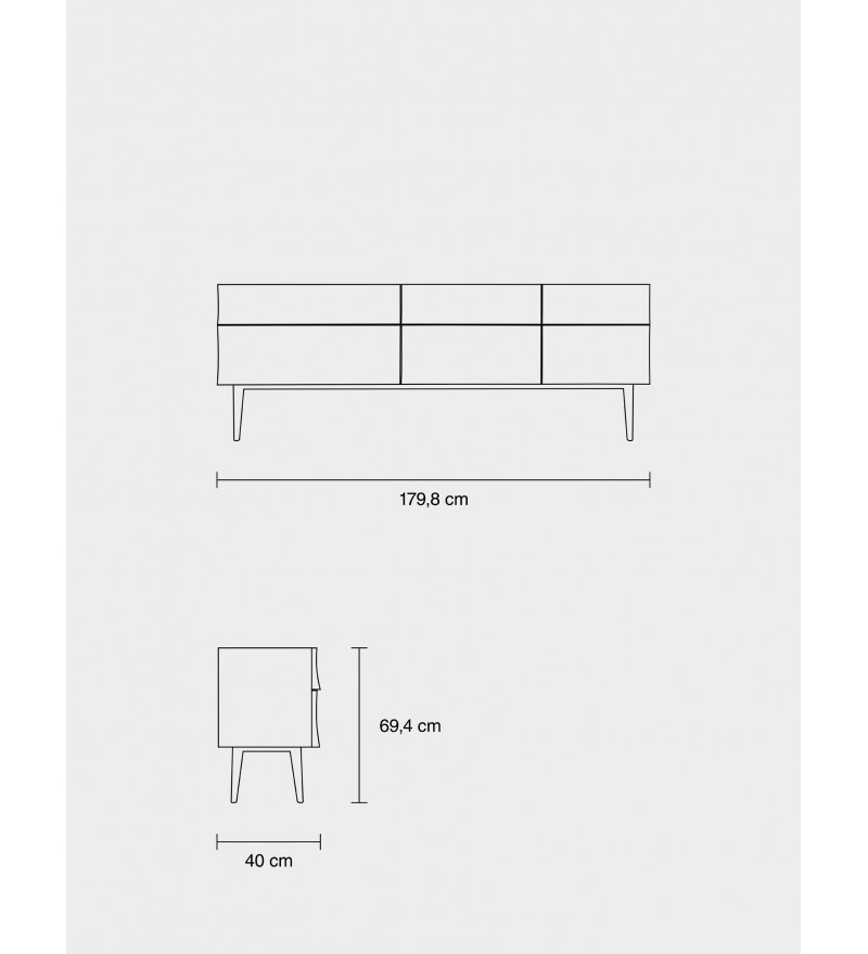 Wymiary: długość 179.8 cm, głębokość 40 cm, wysokość 69.4 cm, wysokość nóg 27 cm