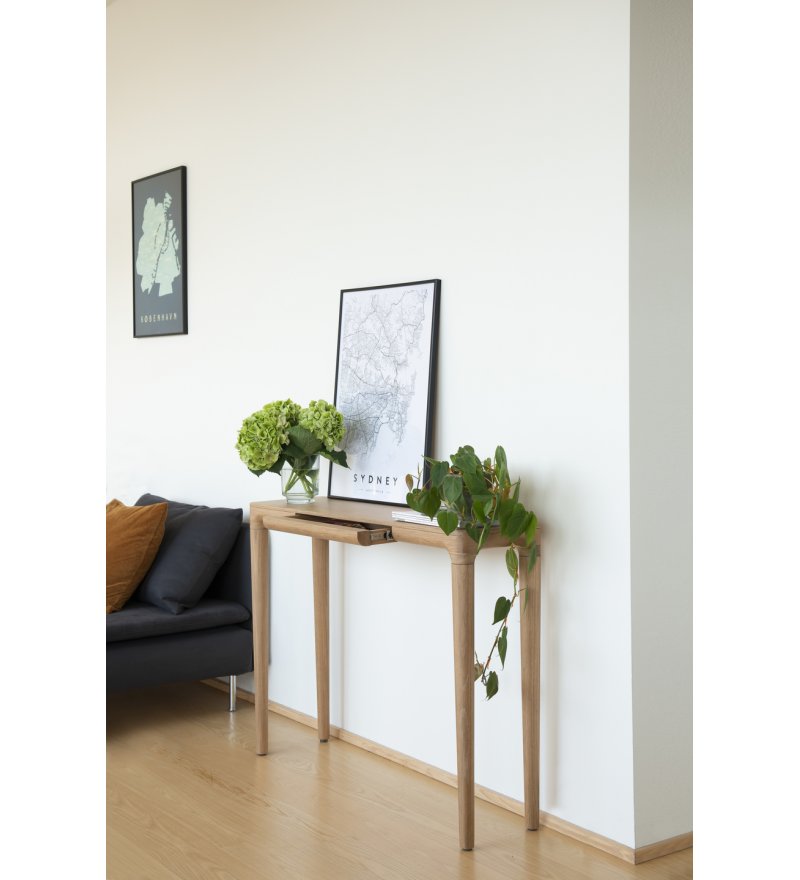 Stylowa i dyskretna konsola Heart'n'Soul UMAGE uosabia funkcjonalność skandynawskiego stylu życia. Posiada wyściełaną tkaniną szufladę, w której możesz trzymać wszystko, czego potrzebujesz gdy wybiegasz z domu: klucze, okulary przeciwsłoneczne czy portfel.