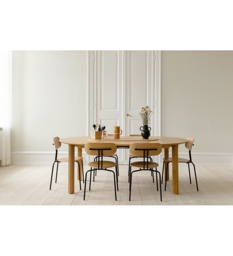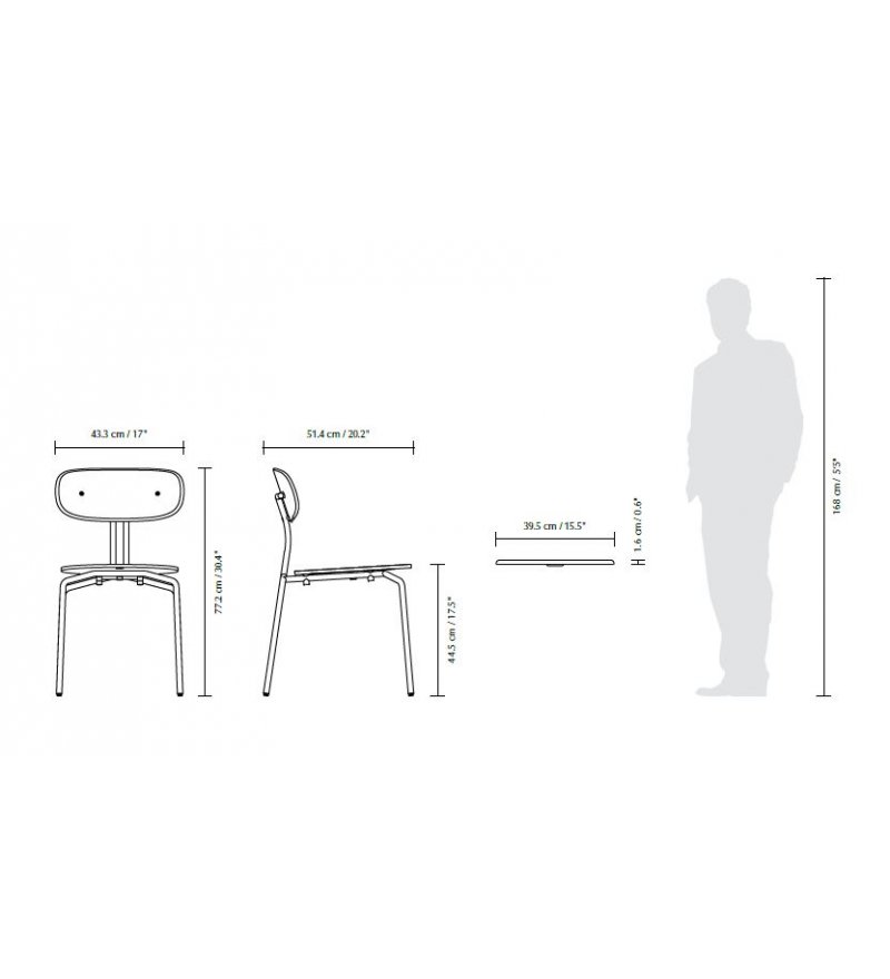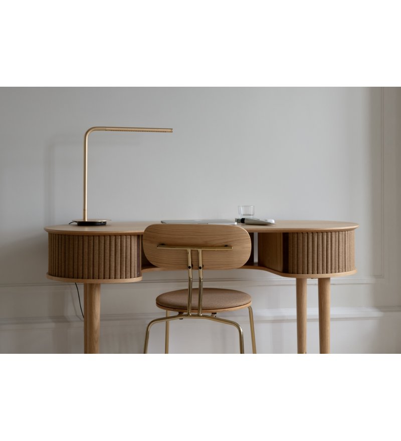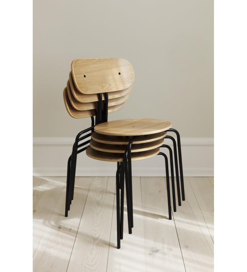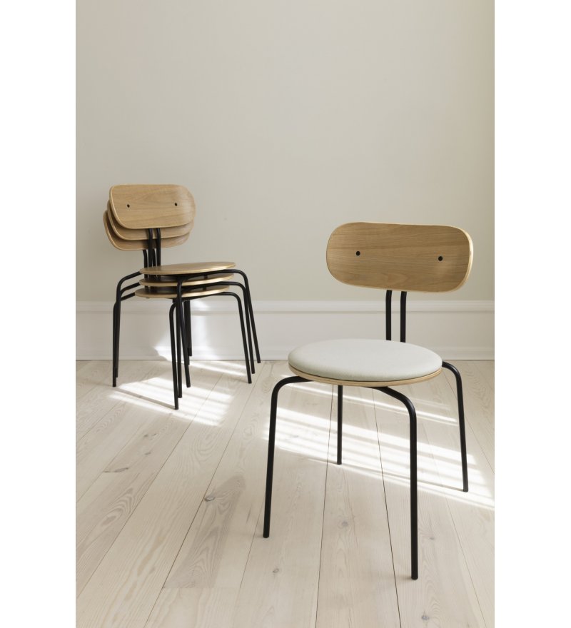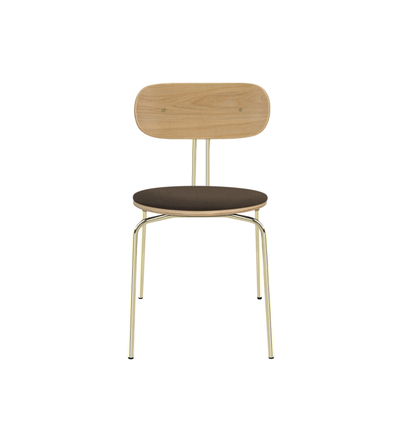 Curious to krzesło z możliwością sztaplowania o lekkim, minimalistycznym i eleganckim wyrazie. Wykonane ze sklejki fornirowanej dębem. Dostępne z mosiężnymi lub czarnymi nogami w wykończeniu gładkim lub z opcją tapicerowanej poduszki na siedzisko, która zwiększa komfort.