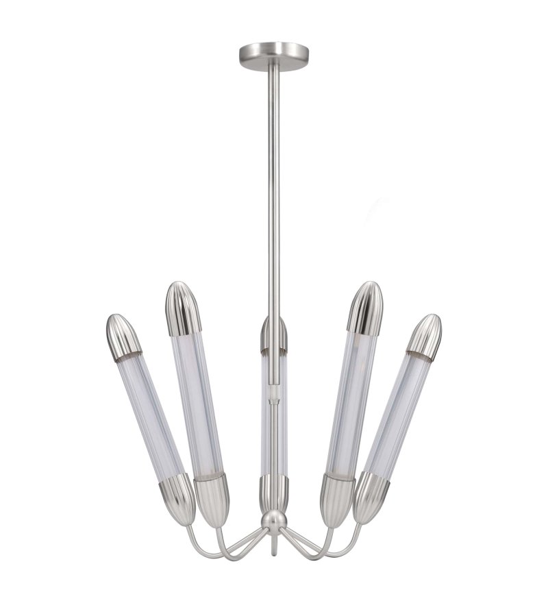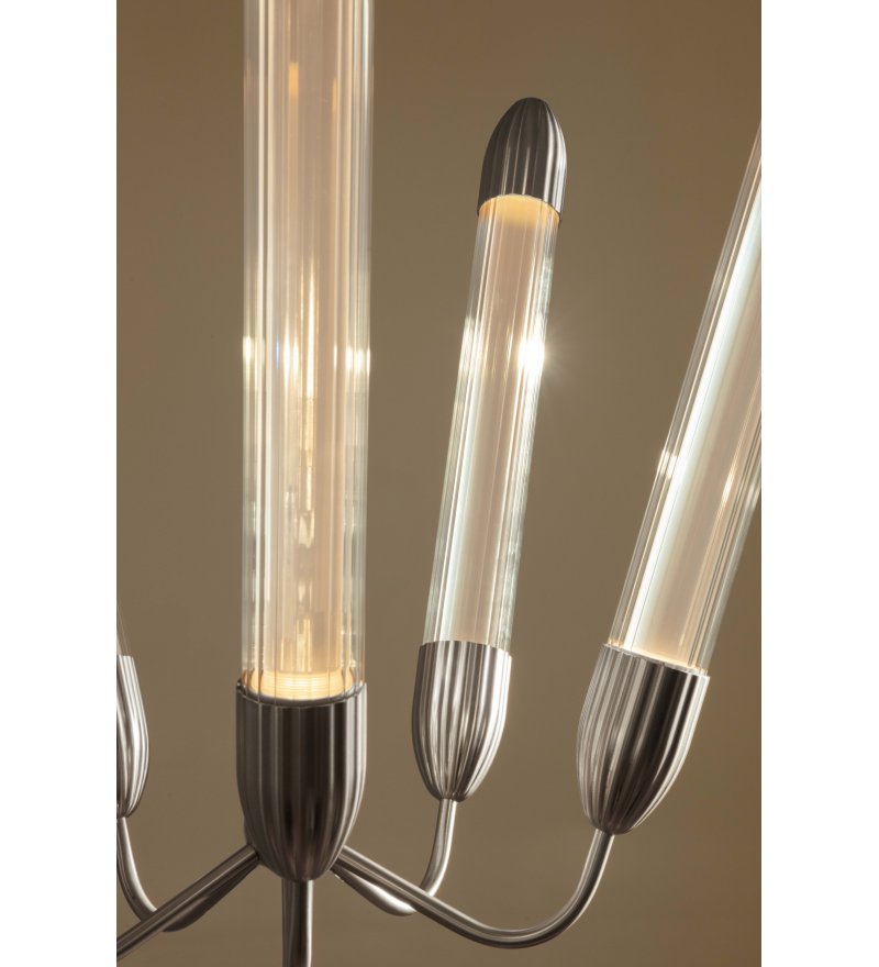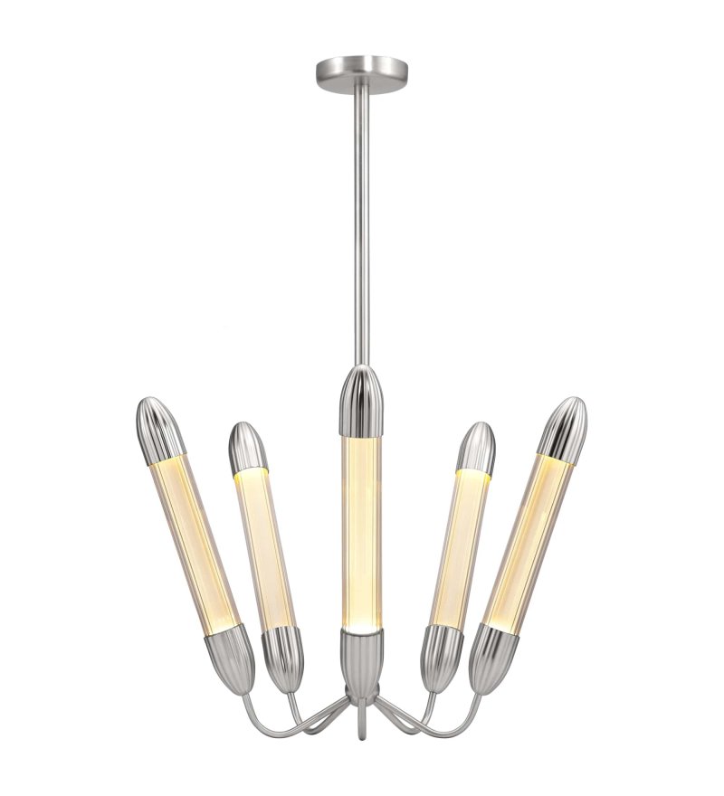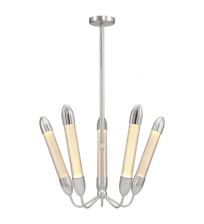 Kolekcja lamp Lemon Squeeze obejmuje kilka modeli lamp w różnych kolorach. Lemon Squeeze Penta short polished steel to żyrandol z pięcioma krótkimi kloszami w kolorze polerowanej stali.