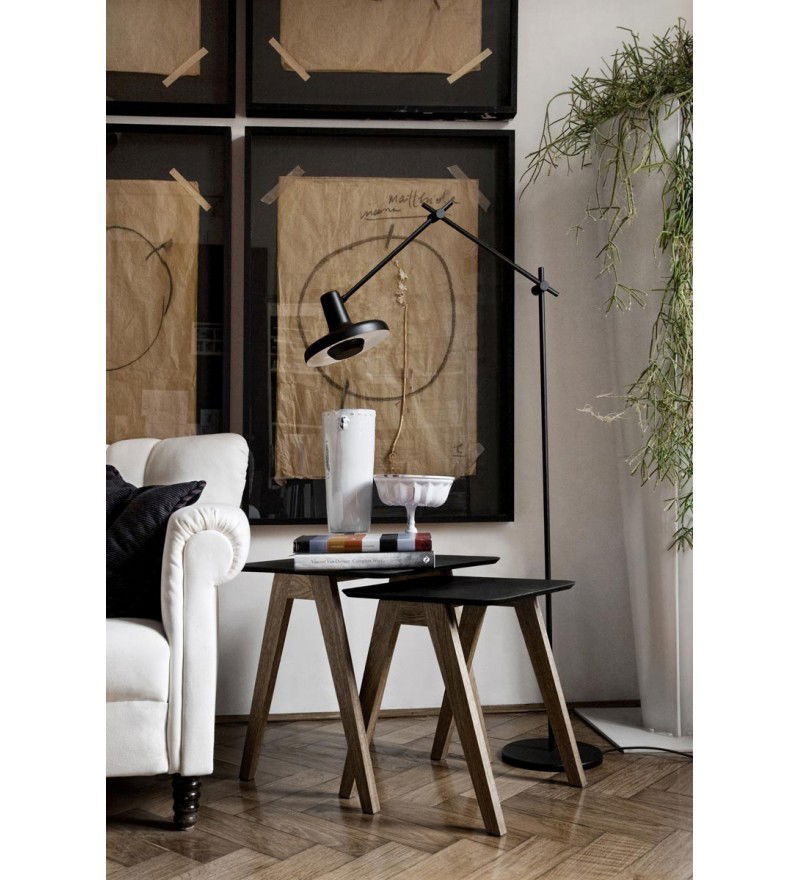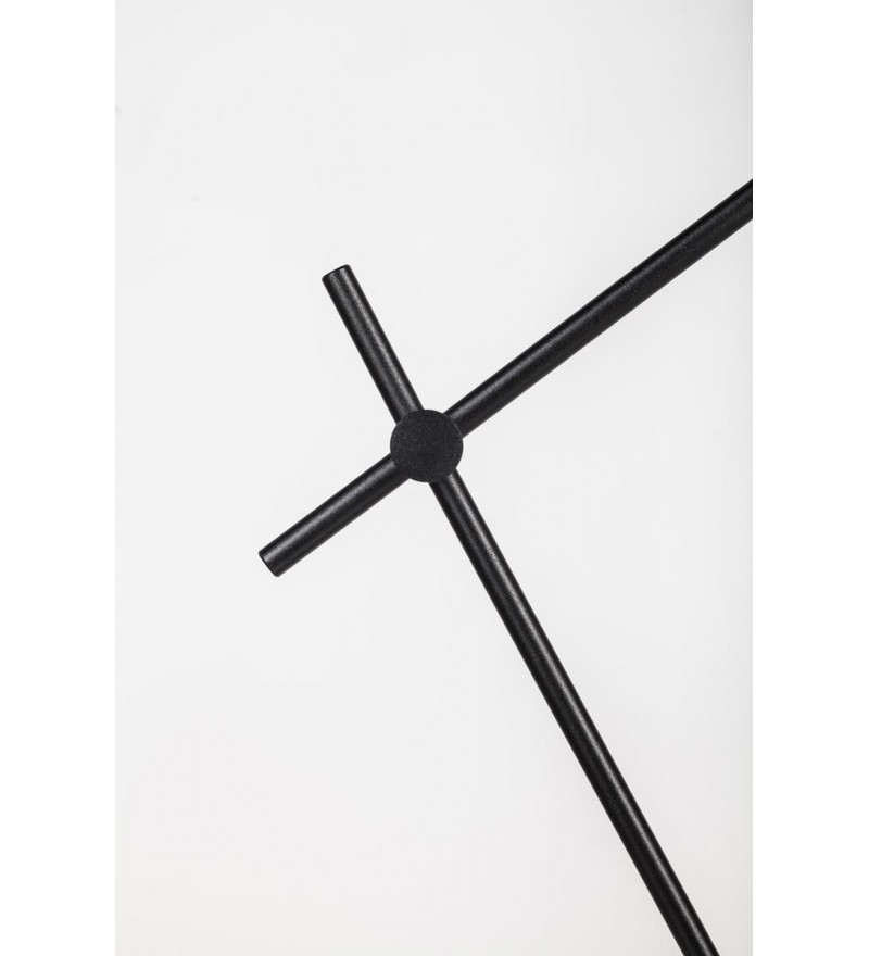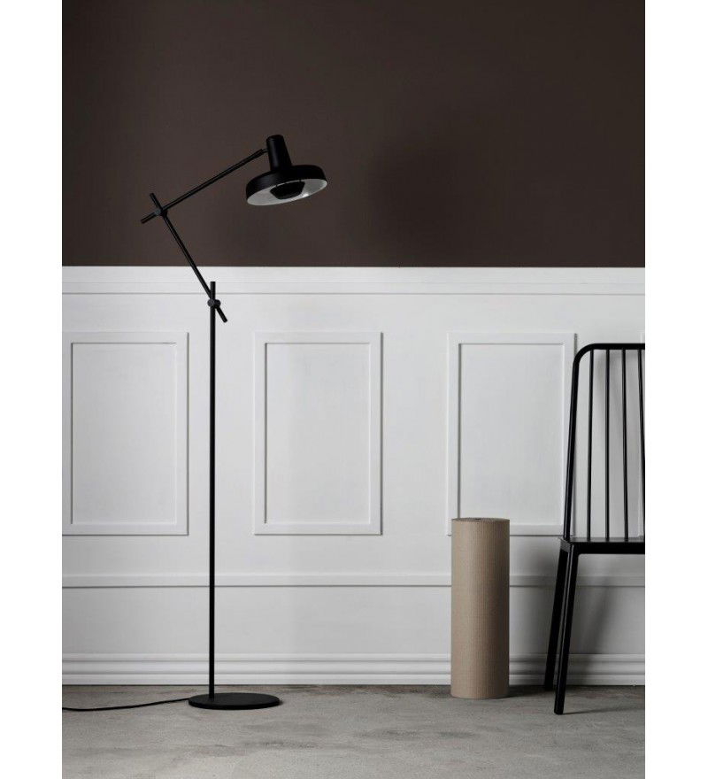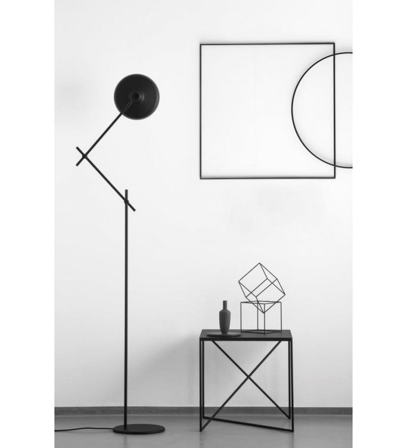 Lampa podłogowa ARIGATO GRUPA to siła prostoty. Jej minimalistyczna forma wykonana została ze stalowych ramion i aluminowego klosza. Całośc pomalowano proszkowo na kolor matowej czerni. Wnętrze klosza jest białe i ciekawie rozprasza światło żarówki. Dzięki zastosowaniu dodatkowego elementu osłaniającego żarówkę uzyskano rozproszone, jasne światło bez efektu oślepienia. Konstrukcja lampy umożliwia regulację ustawienia klosza oraz ramion na każdym ich łączeniu.