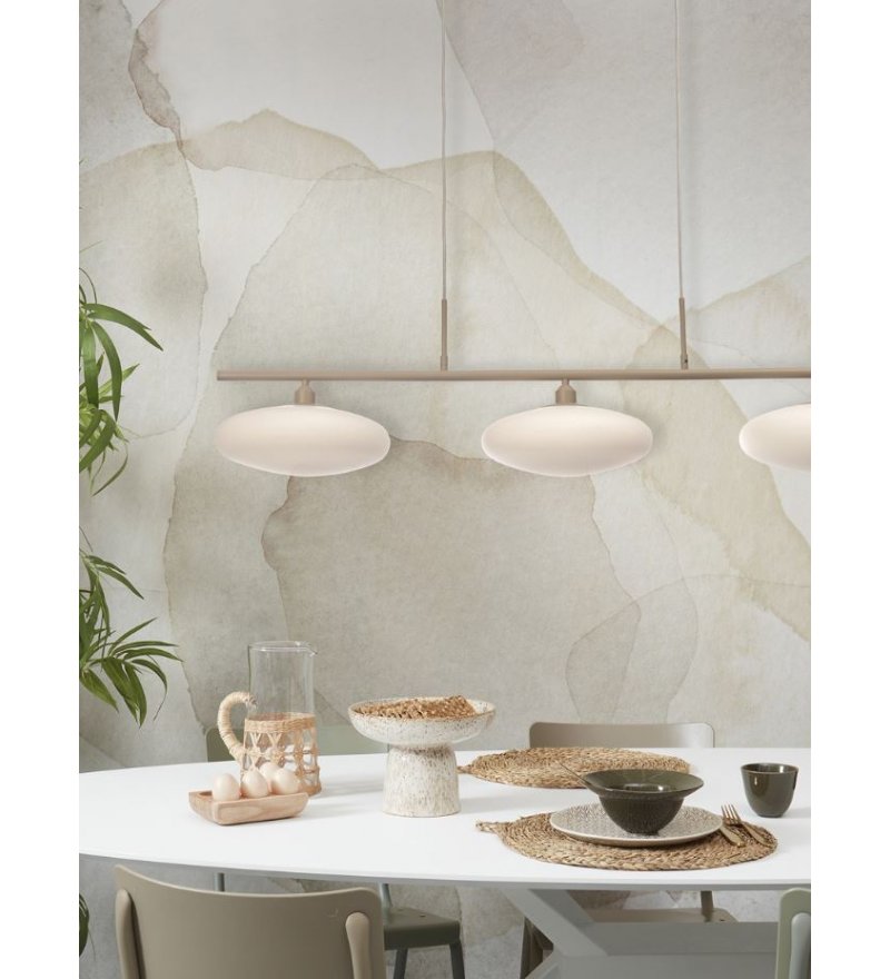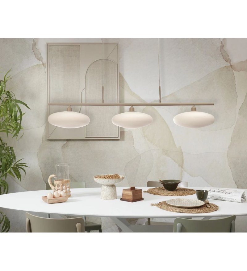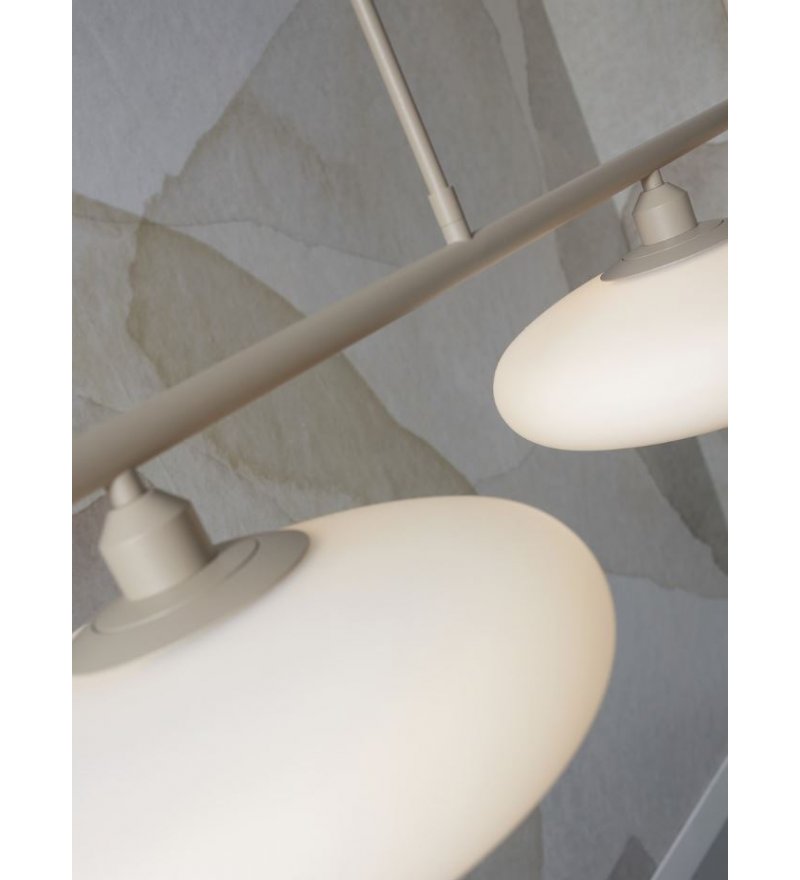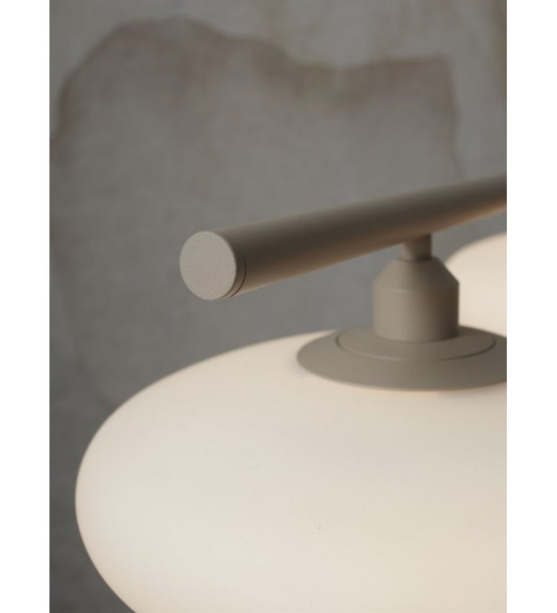 Klosze o średnicy 24 cm emitują miękkie, równomiernie rozproszone światło, które nie oślepia, ale skutecznie rozjaśnia wnętrze, wprowadzając do niego ciepły i przyjazny klimat. Całość utrzymana jest w naturalnej, piaskowej kolorystyce, dzięki czemu lampa wnosi do przestrzeni lekkość i subtelną elegancję.