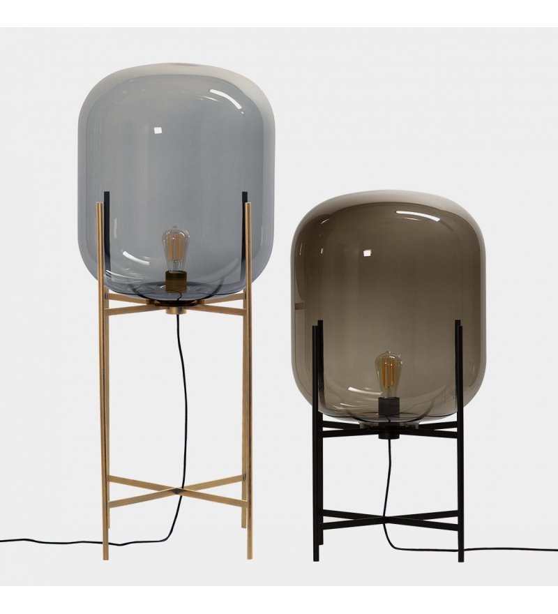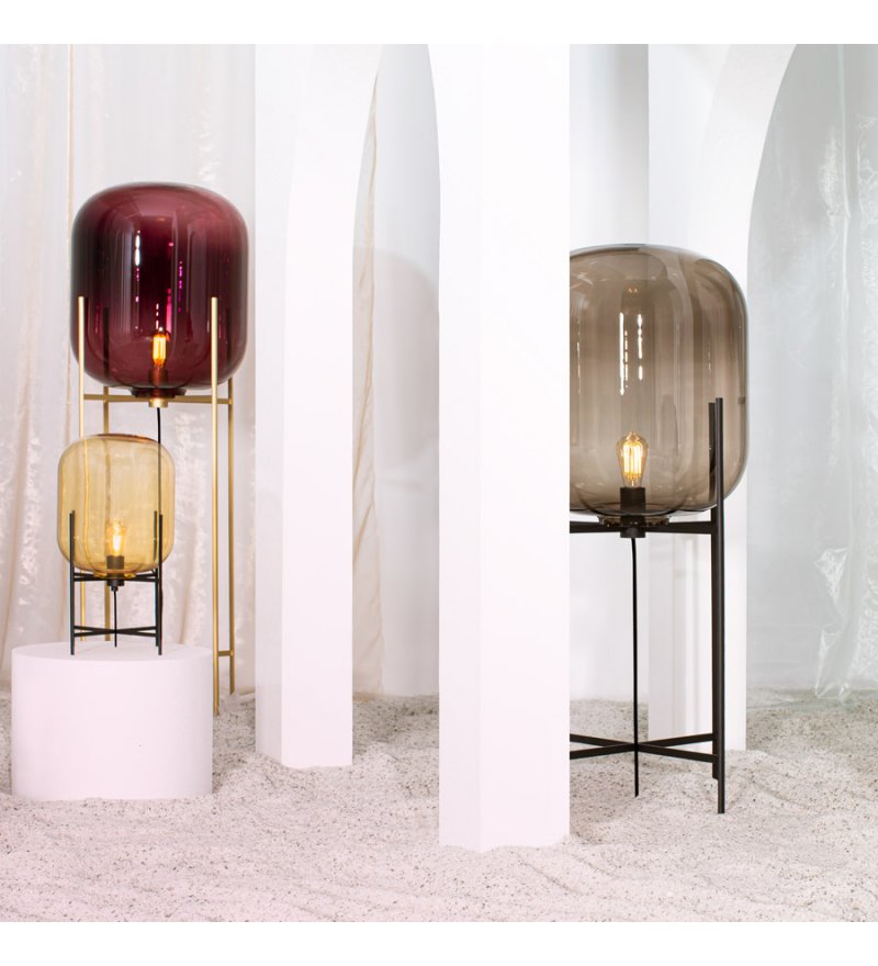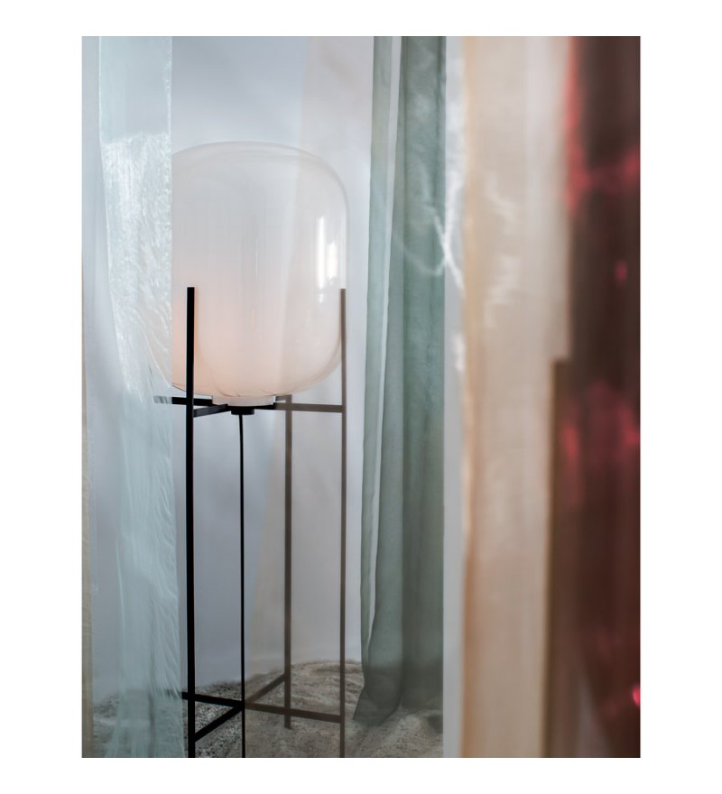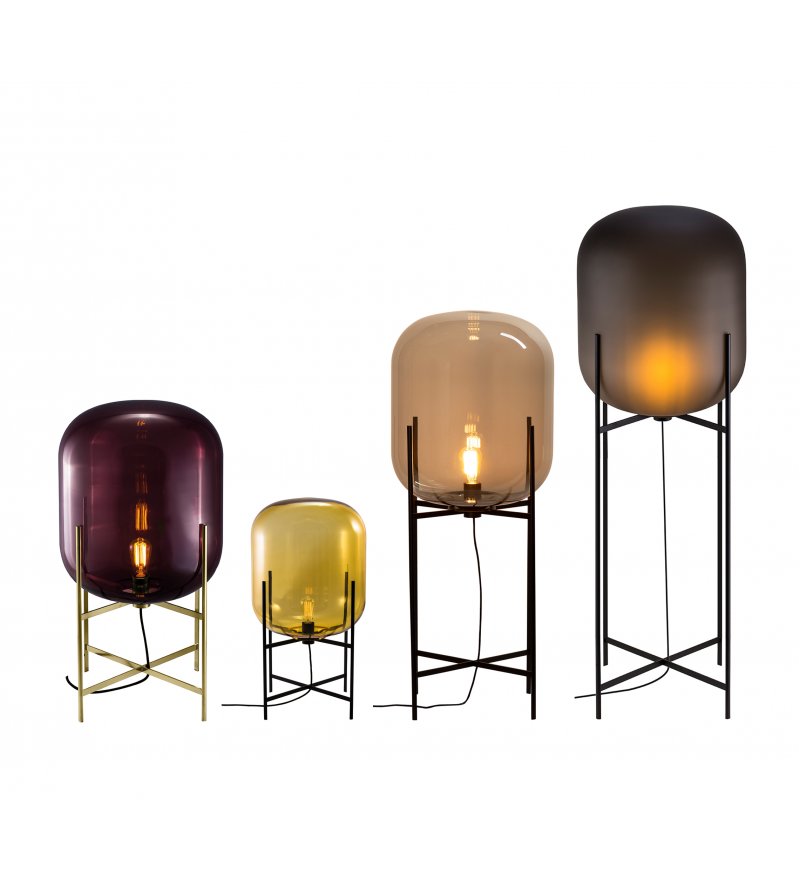 Ręcznie dmuchany klosz dostępny jest w kilku wersjach kolorystycznych: amber, aubergine, moonlight white, smoky grey, smoky grey acetato, steel grey oraz white. Metalowy stelaż dostępny jest w zależności od wersji klosza w kolorze: białym, mosiężnym lub czarnym (wybierz odpowiednią wersję).