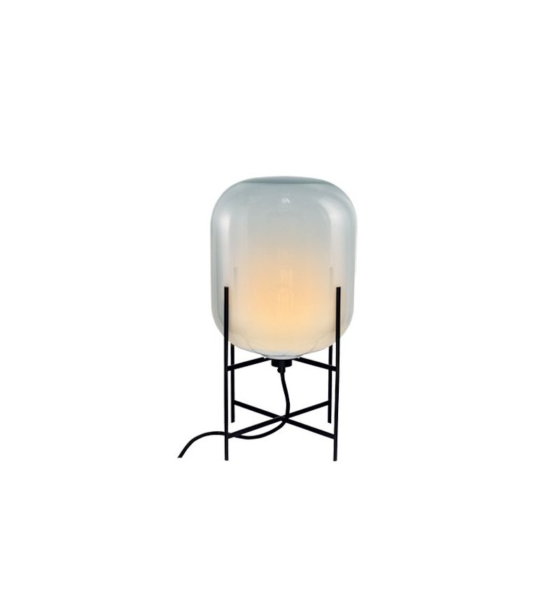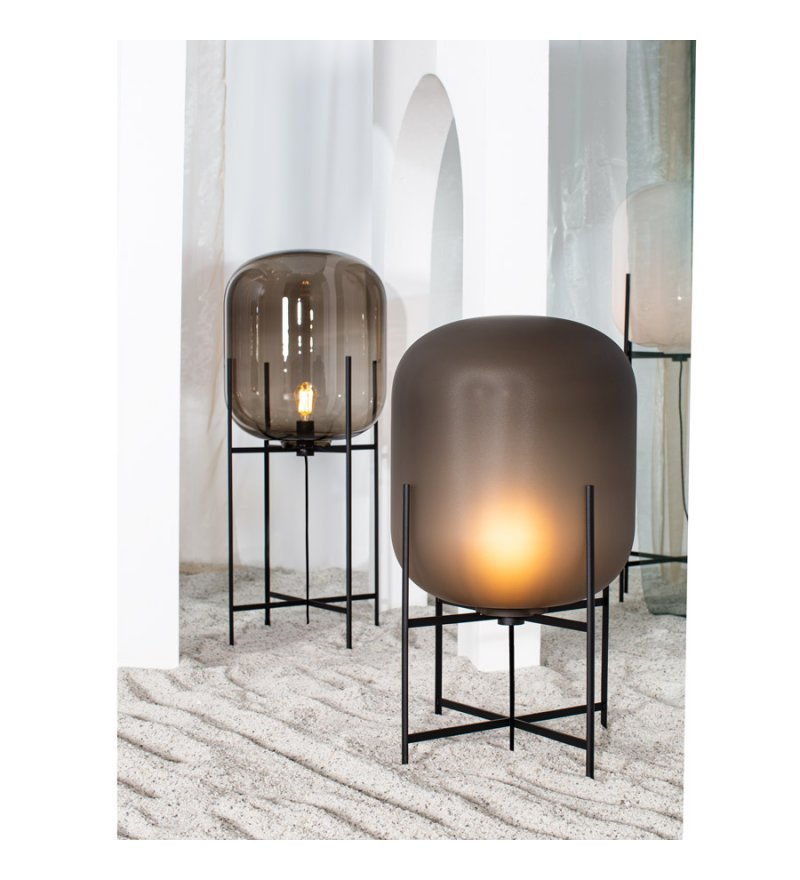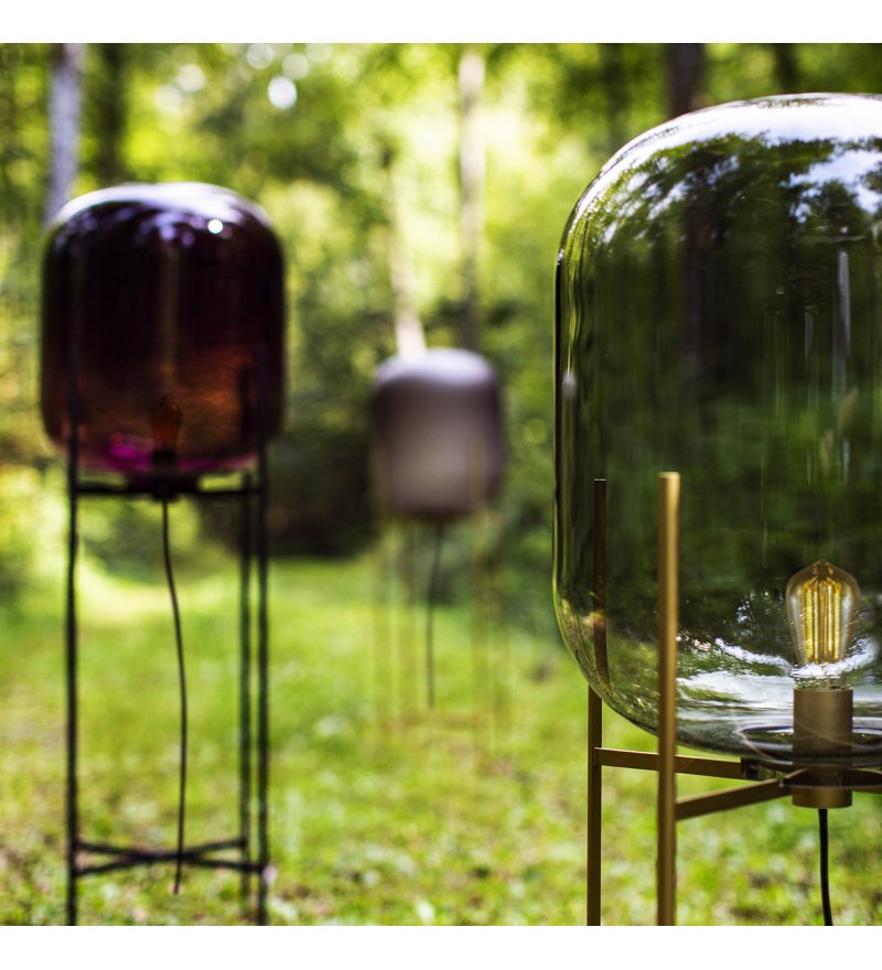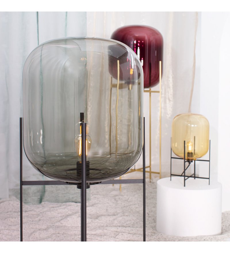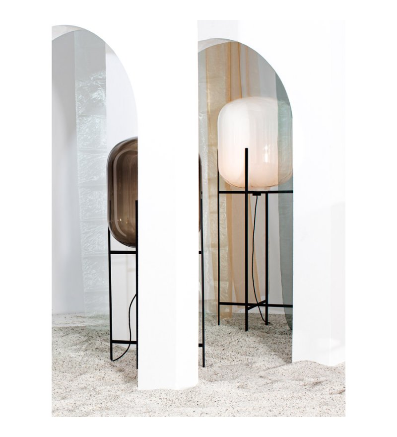 Ręcznie dmuchany klosz dostępny jest w kilku wersjach kolorystycznych: amber, aubergine, moonlight white, smoky grey, smoky grey acetato, steel grey oraz white. Metalowy stelaż dostępny jest w zależności od wersji klosza w kolorze: białym, mosiężnym lub czarnym (wybierz odpowiednią wersję).
