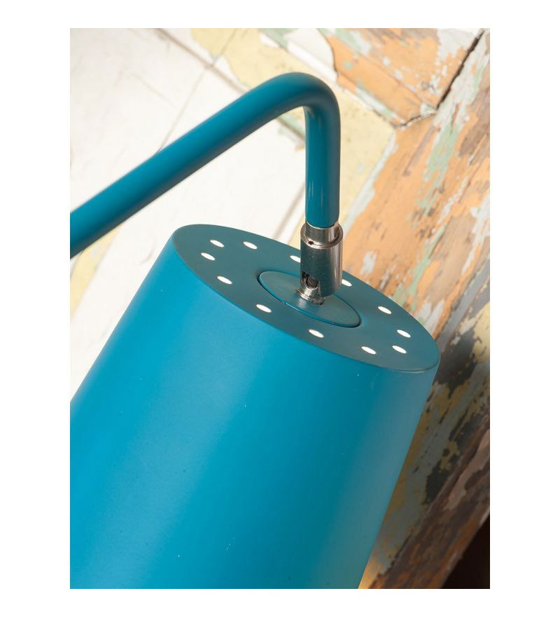 Nowoczesna lampa stołowa BACELONA od It's About Romi wykonana z metalu w kolorze niebieskim matowym o nietypowej, wygiętej formie opierajacej się na trójnożnej podstawie. Wnętrze abażura wykonane jest w kolorze kontarastowej bieli co w połączeniu z niebieskim statywem oraz czarno-białym przewodem dodaje lampie graficznego uroku i sprawia, że jest ciekawym elementem wystroju mieszkania.