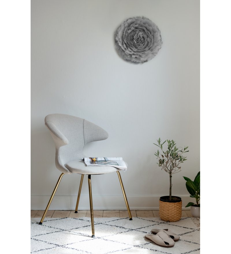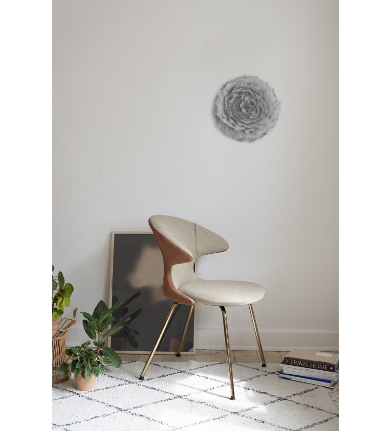 Jej piękny, delikatny klosz mierzy około 40 cm średnicy i 15 cm wysokości. Jest wykonana z autentycznych gęsich piór w kolorze jasnoszarym, z których każde ręcznie, starannie umieszczono na kloszu wykonanym z tkaniny. Emituje przytulny i przyjemny blask, ponieważ żarówki są osłonięte dając klimatyczny nastrój. Eos up jest idealna do zastosowania w sypialni lub jakimkolwiek innym miejscu, w którym chcesz stworzyć subtelny nastrój.