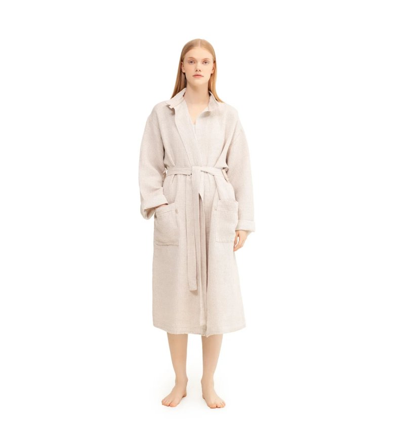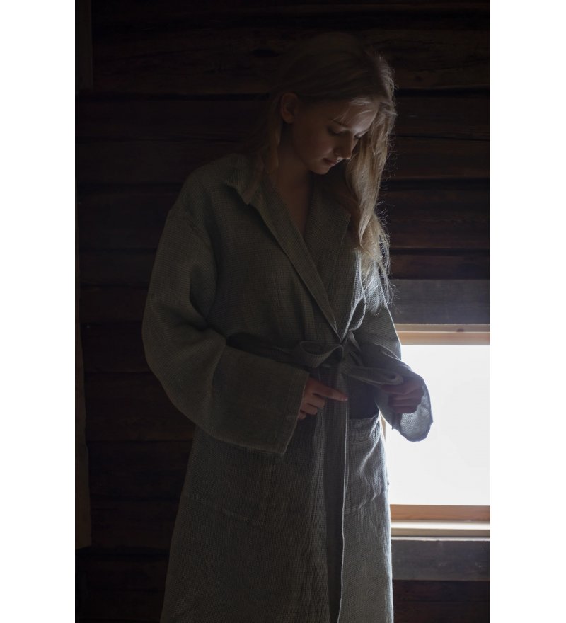Szlafrok TERVA to połączenie naturalnych materiałów i prostoty, która sprawdza się na co dzień i podczas chwil relaksu. Uszyty jest z innowacyjnej tkaniny łączącej len, tencel i bawełnę. Dzięki temu jest przewiewny i przyjemny dla skóry. Dodatkowo – szybko schnie i dobrze chłonie wodę.