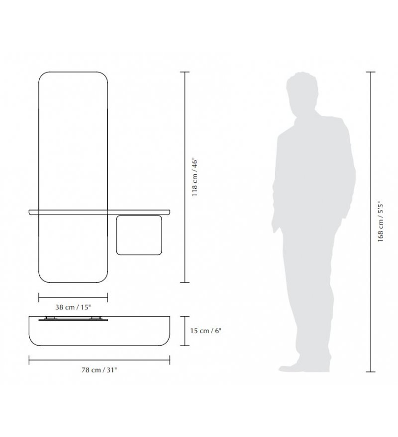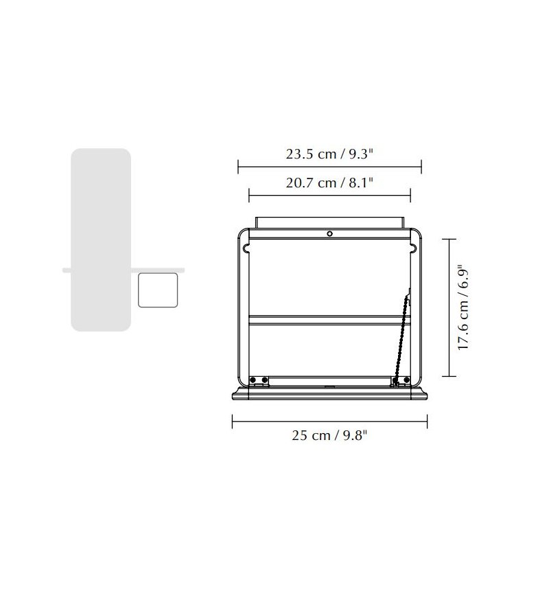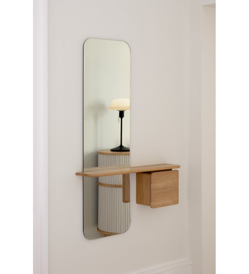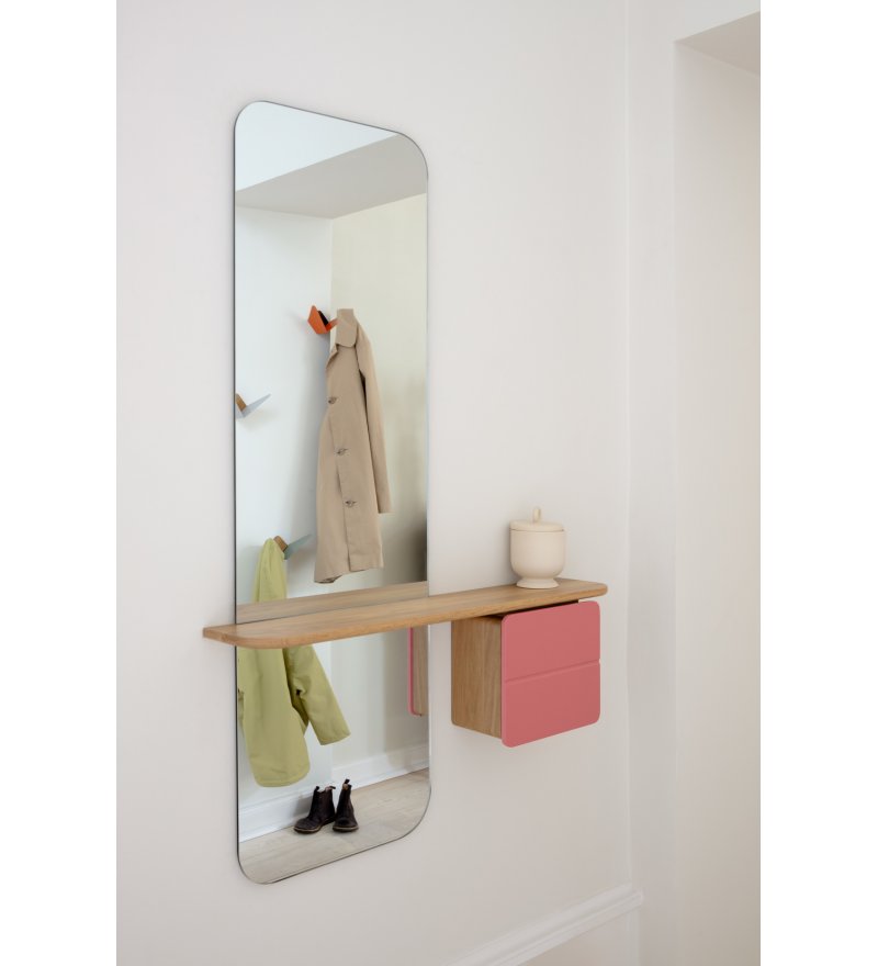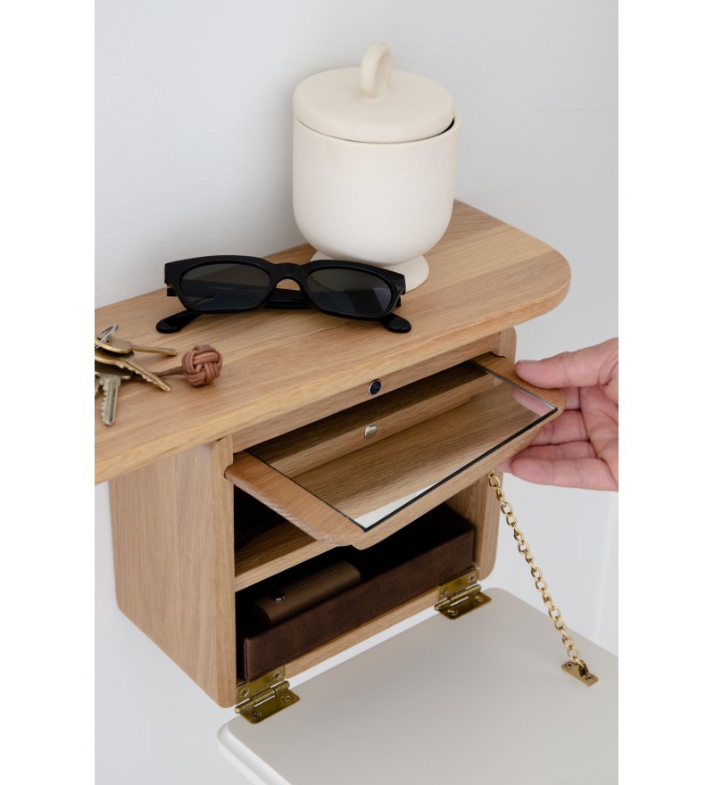 One More Look to proste, minimalistyczne lustro z wieloma dodatkowymi funkcjami. Zaokrągloną na narożnikach, prostokątną taflę szkła urozmaicono wyposażając ją w wąską półkę oraz dodatkową mini-szafkę. Półka to wygodna pomoc, gdy po wejściu do domu chcemy odłożyć gdzieś telefon, kluczyki od auta czy portfel. Z kolei szafka kryje w sobie kilka udogodnień. Znajdziemy w niej małą półkę, skrzyneczkę z eko-skóry na drobiazgi oraz dodatkowe lusterko, dzięki któremu możemy sprawdzić także jak wyglądamy z tyłu - korzystając z odbicia w dużym lustrze. Drzwiczki szafki wykonane są z malowanego na kolor MDF. Nadaje to całości indywidualnego wyrazu. Zamykane są na magnes, a stabilizowane dzięki złotemu łańcuszkowi. W każdej chwili można dokupić jedynie same drzwiczki w innym kolorze, aby szybko zmienić wygląd lustra.