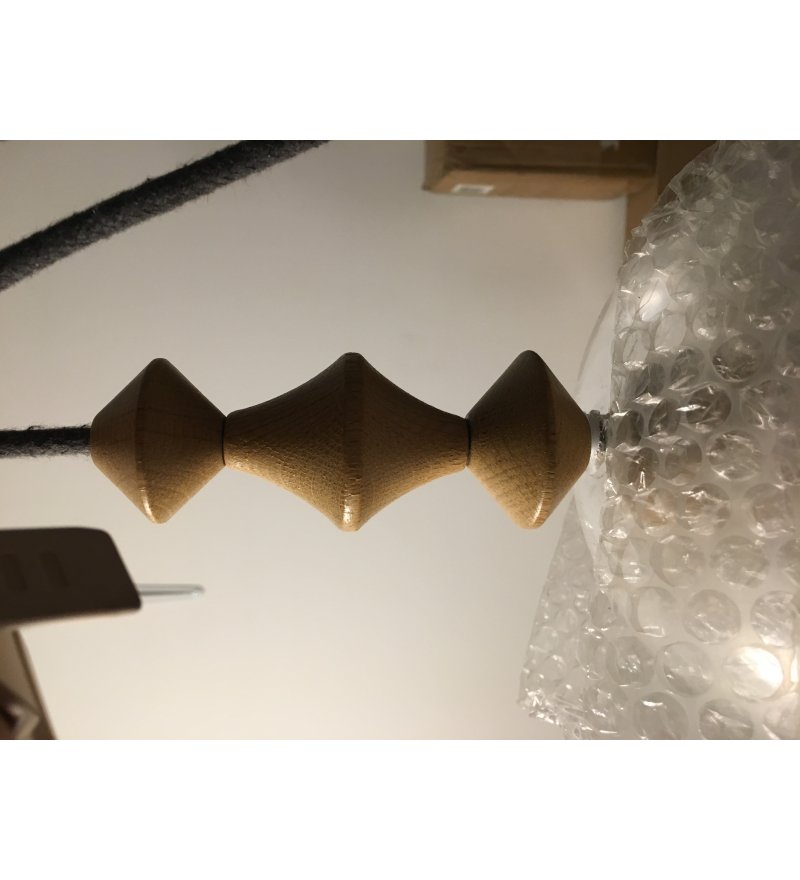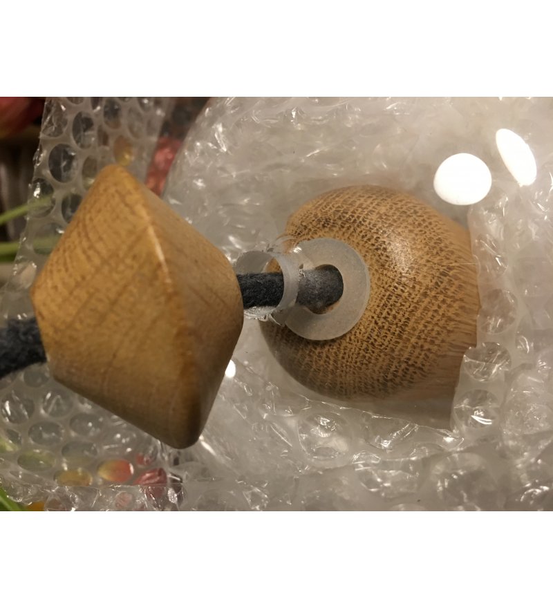 W zestawie znajdują się elementy dębowe wykonane ręcznie, precyzyjnie pokryte bezbarwnym lakierem oraz metalowa podsufitka wraz z delikatną blokadą kabla oraz kostką elektryczną.