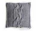 Ręcznie dziergana poduszka z wysokiej jakości, antyalergicznej wełny odpornej na piling (mechacenie). Indywidualny, niepowtarzalny charakter każdego egzemplarza. Poduszka dwustronna w kolorze ciemnej szarości z ozdobnym motywem warkocza na każdej stronie. Tkanina poszewki wkładu w ciemnym kolorze.