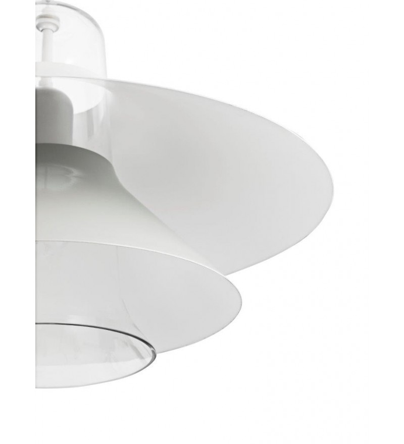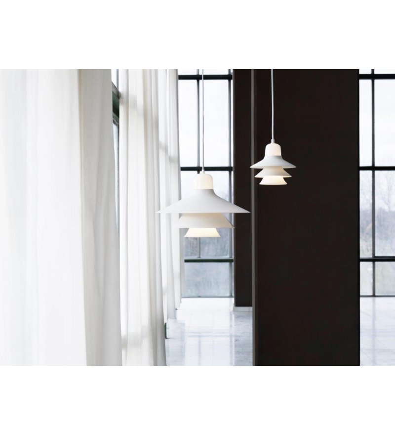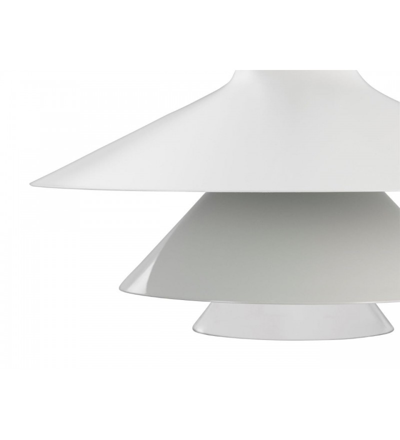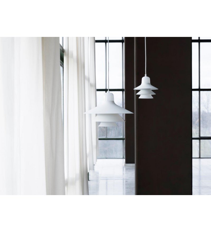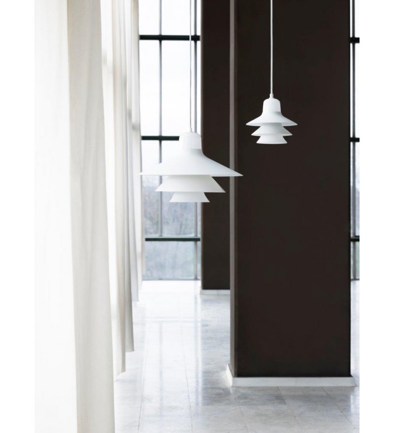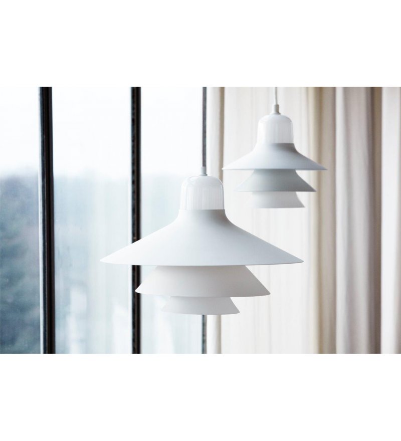 Ikono to piękna lampa wisząca zaprojektowana z wyczuciem czystej formy i prostotą. Lampa posiada stożkowy szklany cylinder i dwa emaliowane stalowe elementy w różnych odcieniach tonalnych tego samego koloru, które się na nim opierają. Wszystkie te cechy składają się na klasyczny kształt skandynawskiej lampy wiszącej. Światło jest kierowane w dół i górę, a poszczególne elementy dodatkowo ciekawie rozpraszają światło na boki.