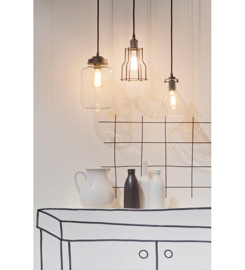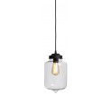 Wisząca lampa MINSK wykonana z przezroczystego szkła, połączonego z matową, czarną, metalową oprawką. Nieco retro, nieco industrialnie.