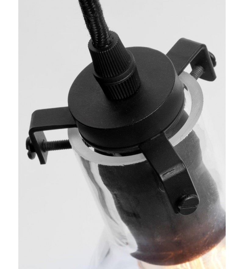 Wisząca lampa KIEV wykonana z przezroczystego szkła, połączonego z matową, czarną, metalową oprawką. Z pewnością znajdzie swoje miejsce we wnętrzach o industrialnym lub retro klimacie.