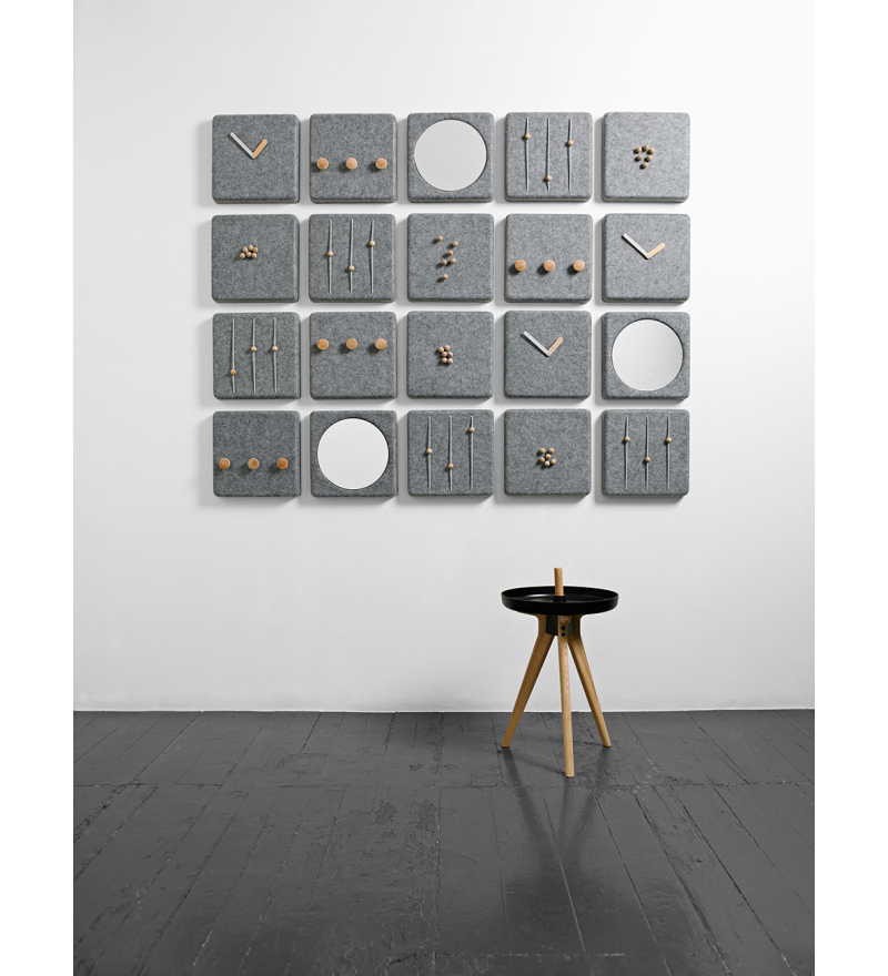 Cała linia filcowych paneli składa się z zegara, wieszaka z drewnianym wykończeniem, wieszaka na klucze z mocnym magnesem, uchwytem na listy oraz lustrem.
