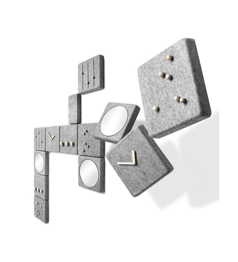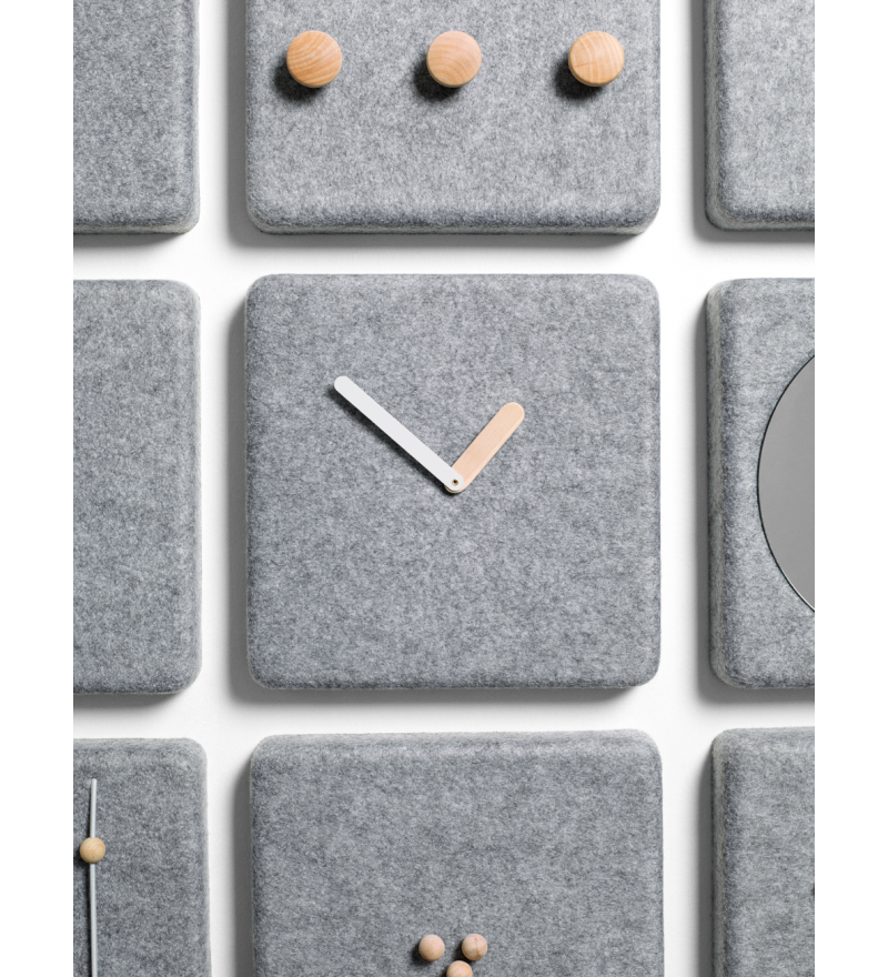Cała linia filcowych paneli składa się z zegara, wieszaka z drewnianym wykończeniem, wieszaka na klucze z mocnym magnesem, uchwytem na listy oraz lustrem.