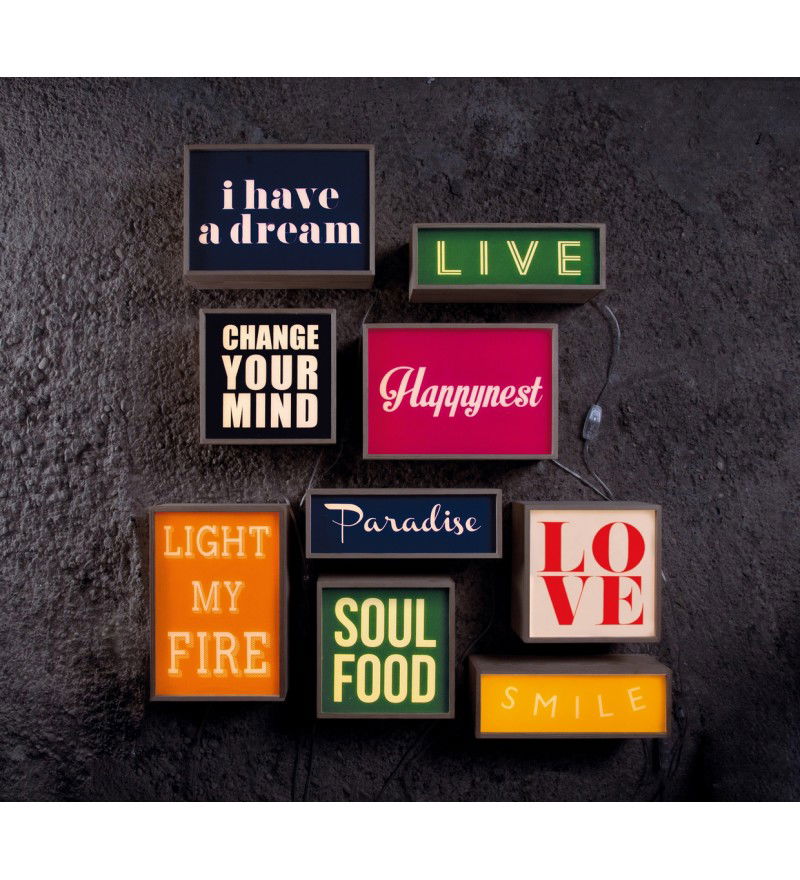 Ożywia, rozwesela i subtelnie oświetla! Lighthink Box to oryginalna lampa, która pozwoli Ci się wyrazić i zindywidualizować swoje wnętrze. Wybierz odpowiedni kolor i hasło, które pasuje do Twojego domu czy aktualnehgo nastroju. Albo stwórz je sam! ;) W zestawie znajdują się: drewniany kaseton oraz trzy warianty kolorystyczne nadruku z pozytywnym przesłaniem (czarna z napisem „CHANGE YOUR MIND", biała z napisem „LOVE" i zielona z napisem „SOUL FOOD") oraz wersja neutralna, którą można dowolnie modyfikować. Rozświetl ważną notatkę, stwórz ciekawe hasło, zostaw wiadomość. Ta lampa to pomysłowy sposób na urozmaicenie każdej przestrzeni!