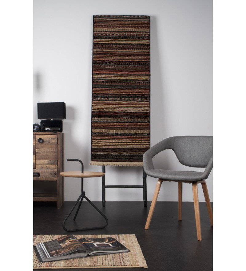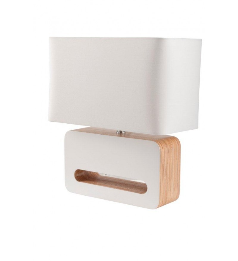 Lampa o ciekawej podstawie wykonanej z wielu warstw drewna o połyskującym lakierowanym wykończeniu paneli zewnętrznych. Całość uzupełnia abażur z tkaniny o przekroju prostokąta z zaokrąglonymi narożnikami, co nawiązuje do formy samej podstawy.