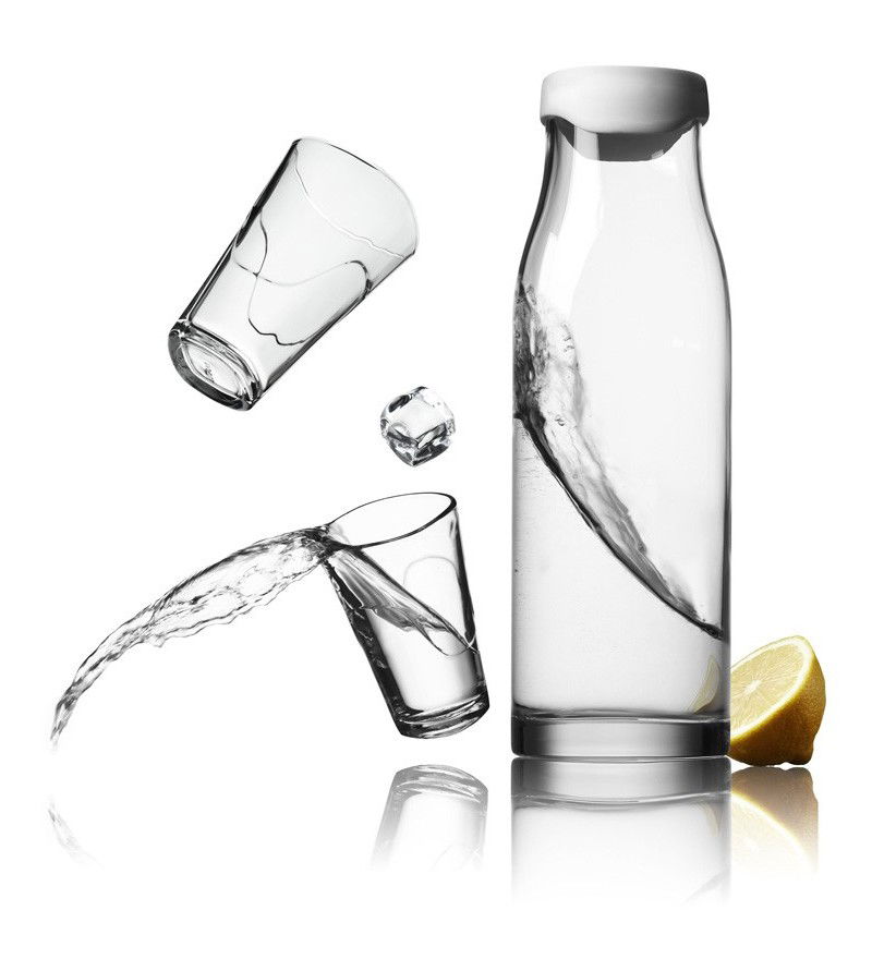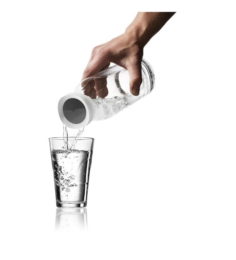 Karafka z bezbarwnego szkła, stali nierdzewnej oraz silikonu. Wyposażona w stalowy biały korek umieszczony na górnej części szyjki oraz bardzo funkcjonalne zamknięcie, które otwiera się automatycznie przy przechylaniu karafki oraz zamyka się, gdy skończymy nalewanie napoju. Dzięki temu plasterki cytryny lub kostki lodu pozostaną na swoim miejscu, a napój będzie długo świeży.
