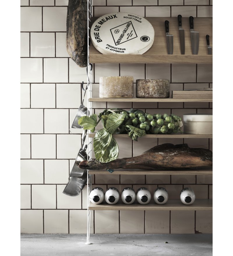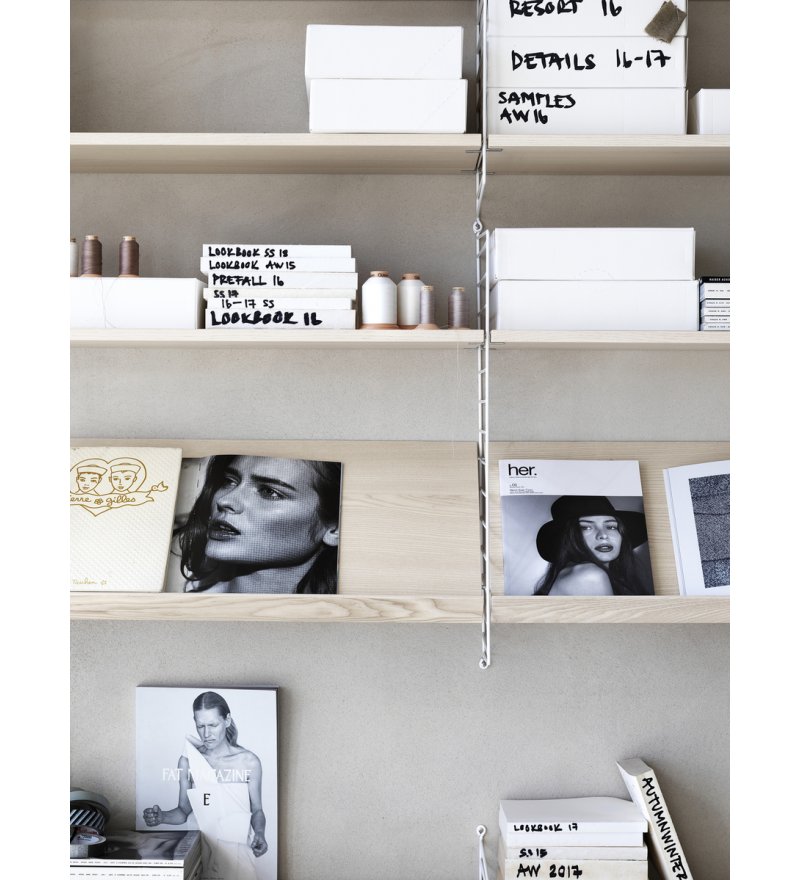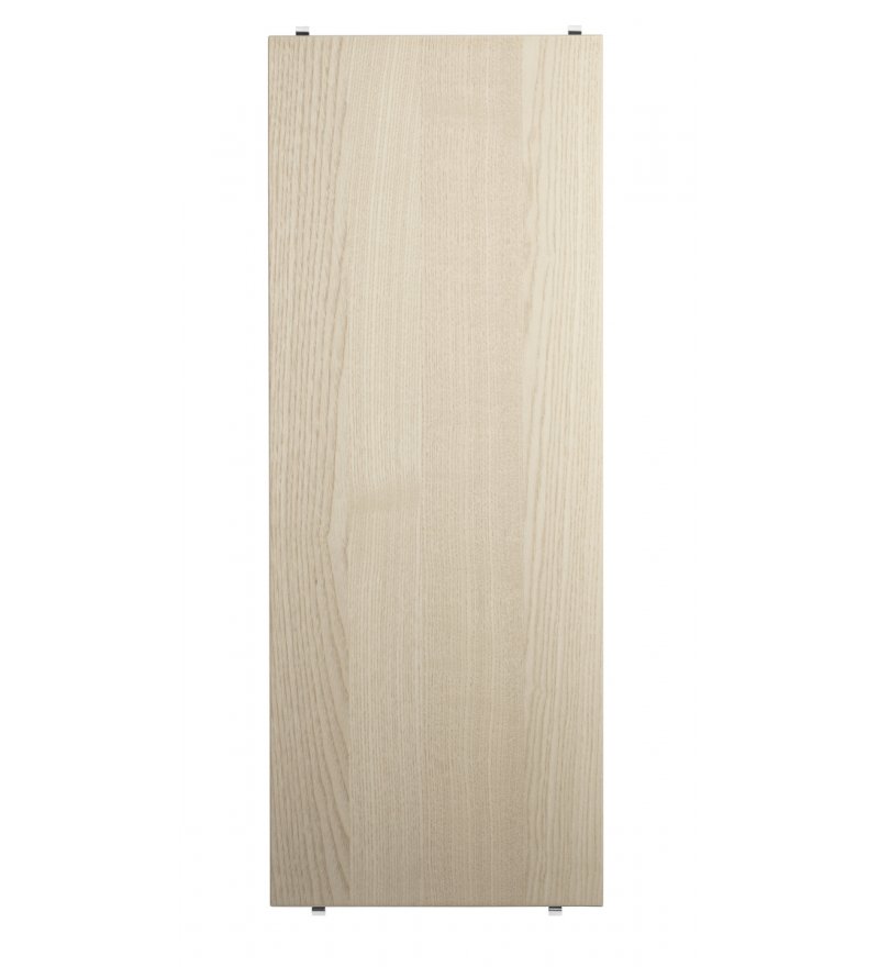 Drewniane półki dostępne są w 4 rozmiarach: o szerokości 58 cm lub 78 cm oraz głębokości 20 lub 30 cm. Pasują do paneli z Systemu String® o tej samej głębokości. Półki są bardzo praktyczne - łatwo je przesuwać, a tym samym dopasować do indywidualnych preferencji. Łącząc kolory i rodzaje półek, można tworzyć koncepcje zarówno monochromatyczne, jak i wielokolorowe.