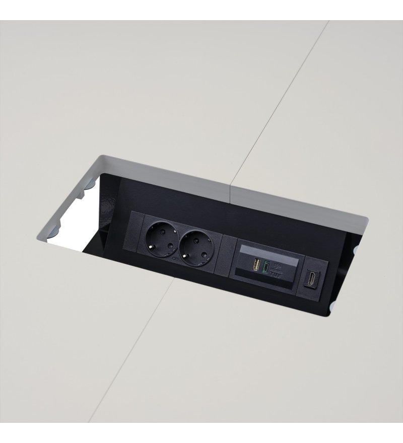 Prostokątne gniazdo zasilania to wszechstronne akcesorium z tworzywa ABS, zaprojektowane jako uzupełnienie stołów Midst ze specjalnym wycięciem. Dzięki eleganckiemu i funkcjonalnemu wzornictwu gwarantuje, że Twój stół będzie zawsze wyposażony w niezawodny dostęp do zasilania, idealny zarówno do pracy, jak i wypoczynku. Gniazdo obejmuje miejsce na 4 wtyczki + 2x QF15 TUF USB A + USB C HP + 1x Cat6 3m + 1x HDMI 3m.