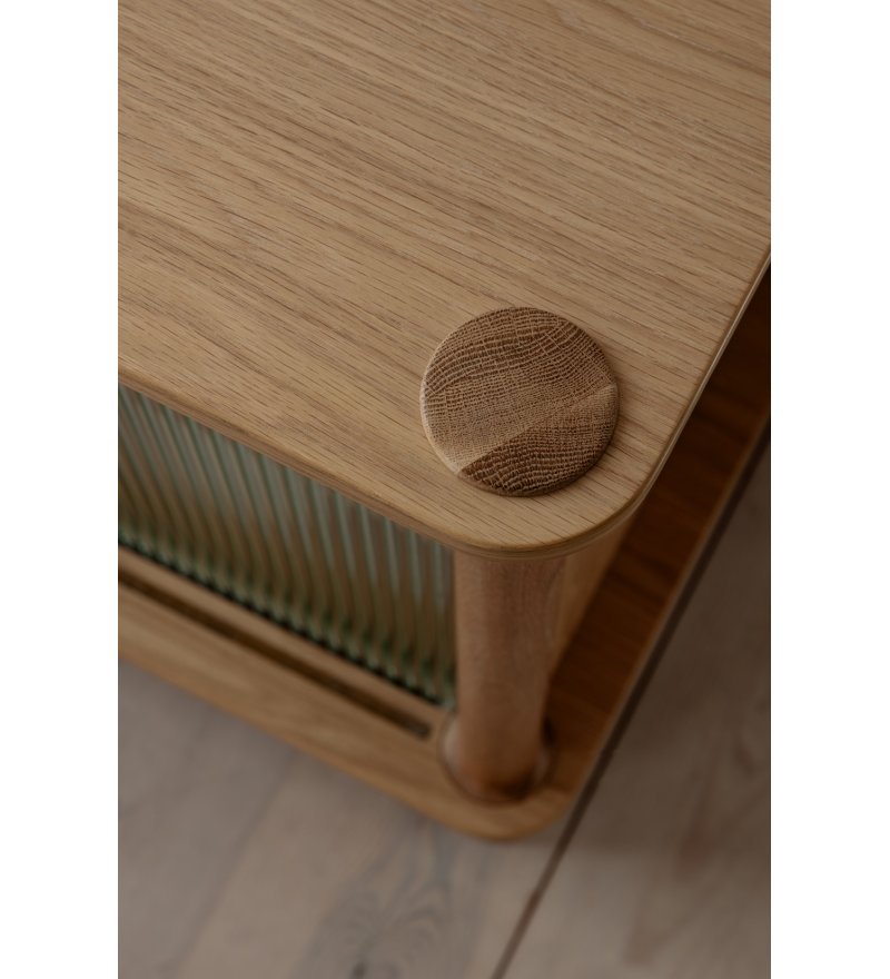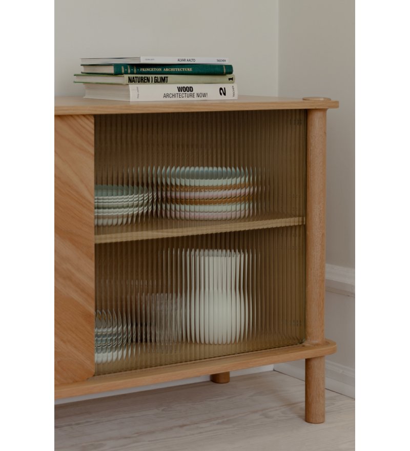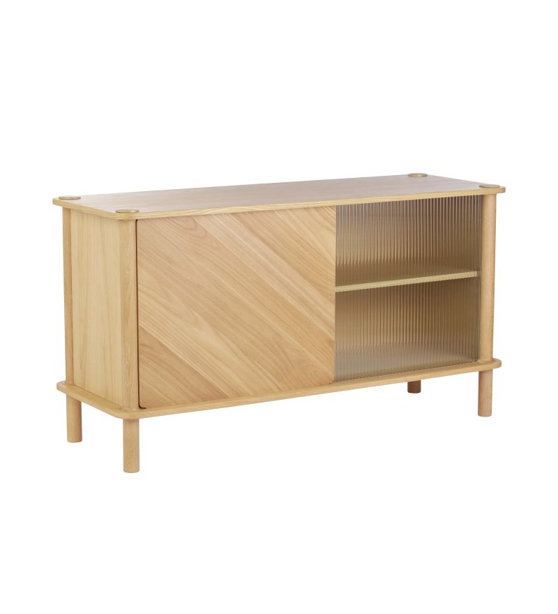 Ta wersja komody posiada dwoje drzwi: w kolorze naturalnego dębu oraz z bezbarwnego ryflowanego szkła.