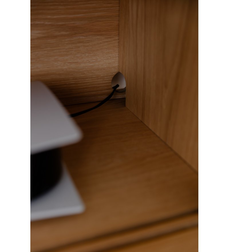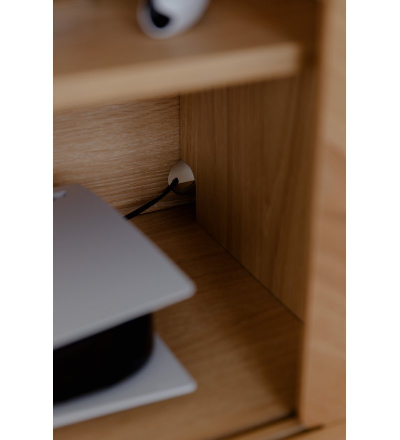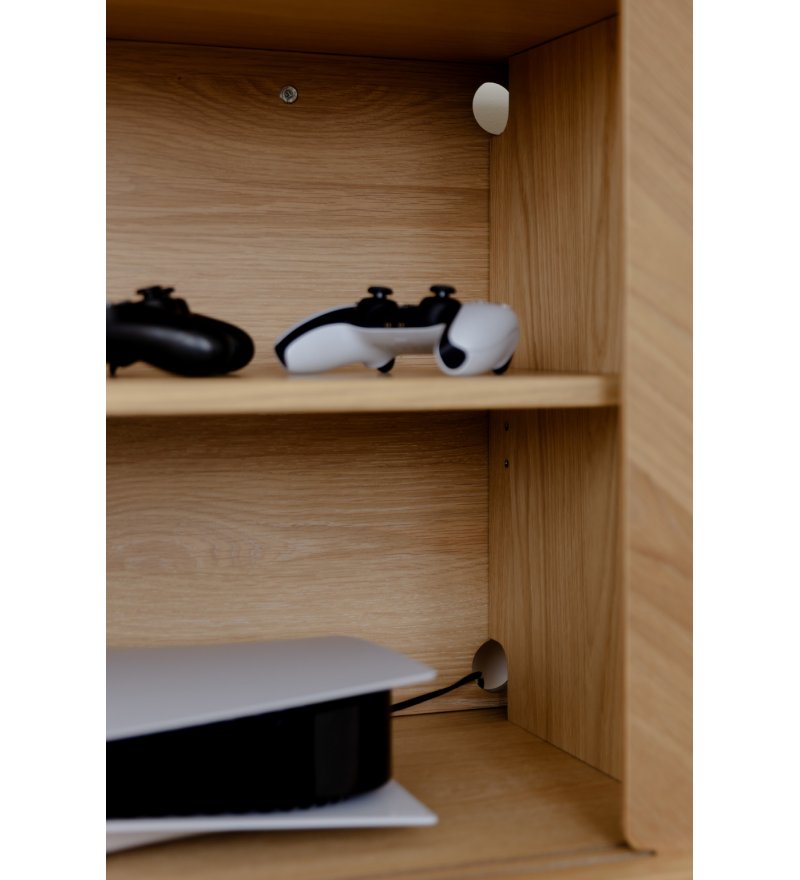 Drzwi w komodach Italic UMAGE są przesuwne, a za każdymi z nich kryje się przestrzeń z dodatkową półką o regulowanej wysokości. W tylnej części komody znajdują się również specjalne otwory umożliwiające na wprowadzenie przewodów, a tym samym wykorzystanie komody jako szafki audio / RTV.