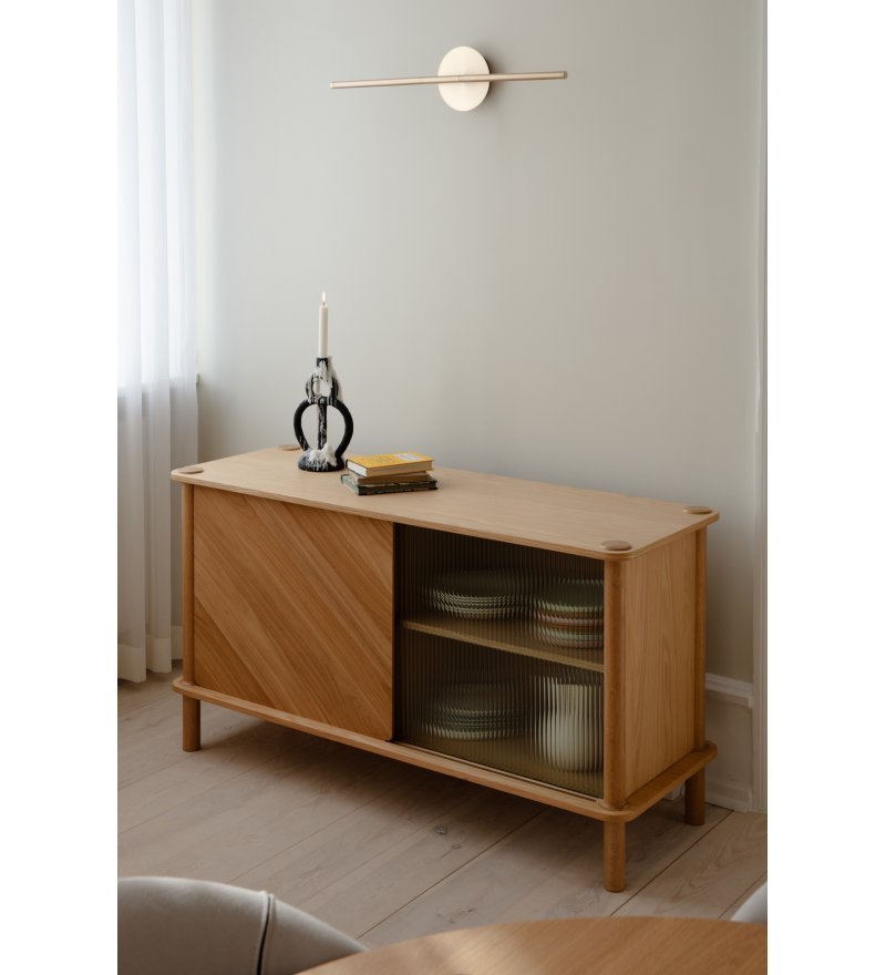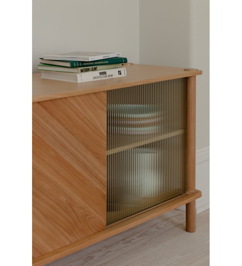 Kolekcja komód Italic oferuje kilka wersji wykończenia dzięki możliwości miksowania drzwi wykonanych z pięknego ryflowanego szkła lub dębu. Tym samym kredens Italic pozwala na personalizację: drzwi można mieszać i dopasowywać, aby stworzyć ekspresję mebla harmonijnie zgraną z wnętrzem. Drewniane drzwi mają dwie strony: jedna strona z ukośnym fornirowanym panelem dla nieszablonowego wyglądu, a drugą stronę z pionowym fornirem dla ponadczasowego stylu. Ukośne linie drewnianych drzwi pięknie oddają elegancję asymetrii i dodają projektowi zwiewnego wyrazu. W każdej chwili drzwiczki można zdemontować i zmienić układ forniru na inny. Komoda Italic może być zamówiona w kilku kombinacjach: z drzwiami drewnianymi, szklanymi lub mieszanką tych dwóch rodzajów drzwi.