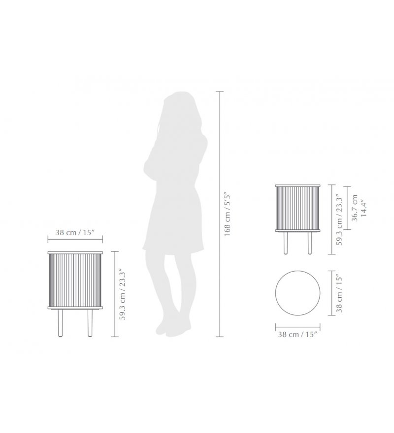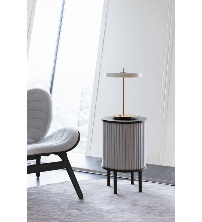 Stolik Audacious zyskał wygodny, okrągły kształt o średnicy 38 cm. Nie traci jednak swojego nordyckiego charakteru i wyraźnie nawiązuje formą do klasyki duńskiego designu. Konstrukcja stolika jest solidna i stabilna. Wykonano ją z litego drewna dębowego i bukowego oraz fornirowanej sklejki. Żaluzja tapicerowana jest eko-skórą o strukturze nubuku.