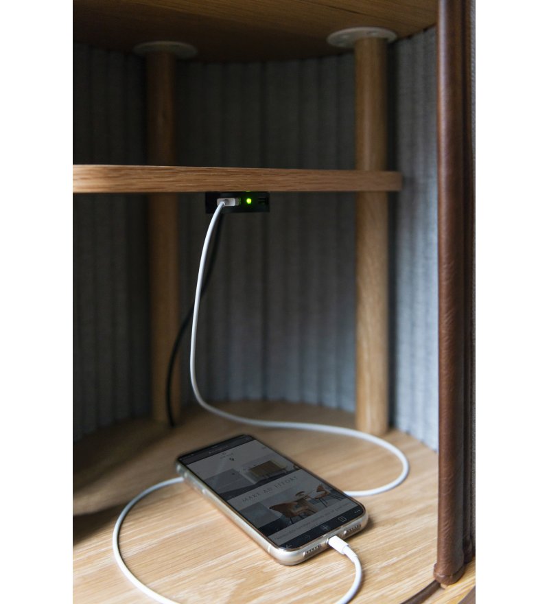 Stolik Audacious jest kompaktowym, lecz praktycznym meblem. Jego niewielkie rozmiary świetnie wpiszą się w nawet niewielkie przestrzenie, jednakże ilość miejsca w środku spore możliwości. Jedna z półek została specjalnie wyprofilowana, dzięki czemu w szafce zmieszczą się np. wyższe książki. Audacious możesz użyć także jako eleganckiego barku na alkohol, szklanki i kieliszki. Audacious UMAGE wyposażono w ukryty hub USB, który umożliwia ładowanie do 5 urządzeń jednocześnie. To sprawia, że Audacious sprawdzi się także jako poręczny mebel w hotelu czy biurze.