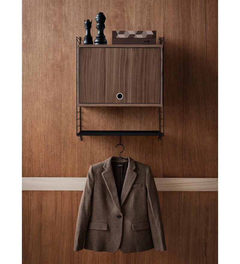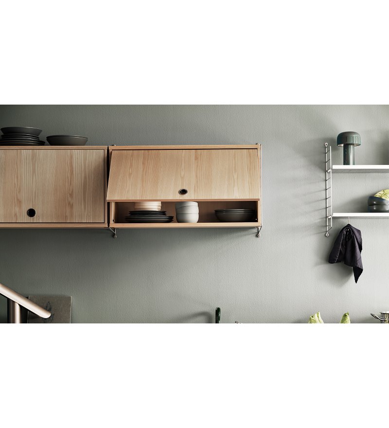 Moduł szafki z drzwiami uchylnymi pasuje do wszystkich paneli systemu String® o głębokości 30 cm. Szafka jest atrakcyjna wizualnie oraz bardzo praktyczna. Wewnątrz znajdziemy dużo dodatkowego miejsca do przechowywania. Przestrzeń podzielona jest regulowaną wewnętrzną półką. Całość wykonana jest solidnie i estetycznie. Posiada duży potencjał aranżacyjny.