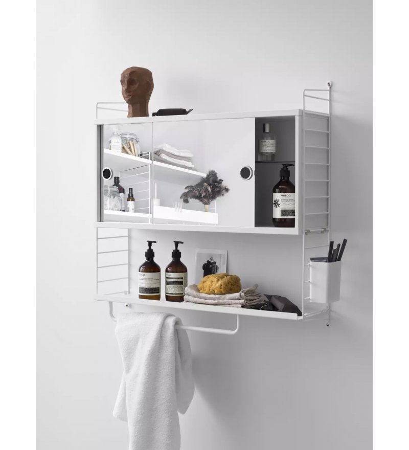 Moduł szafki z przesuwnymi lustrzanymi drzwiami pasuje do paneli systemu String® o tej samej głębokości. Szafka jest atrakcyjna wizualnie oraz bardzo praktyczna. Nadaje się do dodania do zestawu łazienkowego. Lustrzane drzwiczki można łatwo przesuwać w obie strony. Mebel idealnie nadają się do przechowywania szczoteczek do zębów i innych przyborów toaletowych, których nie chcemy zostawiać na widoku. Przestrzeń podzielona jest regulowaną wewnętrzną półką ze szkła. Całość wykonana jest solidnie i estetycznie.